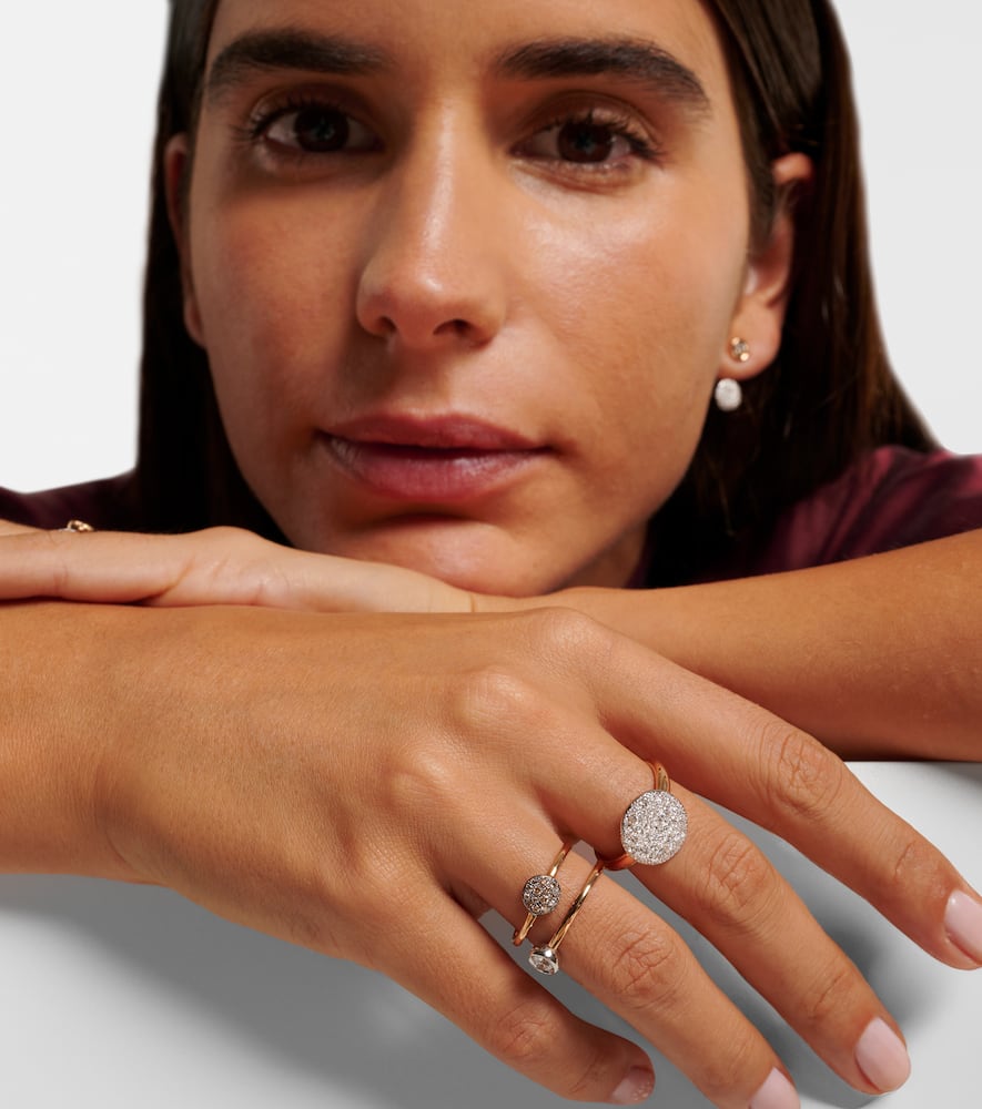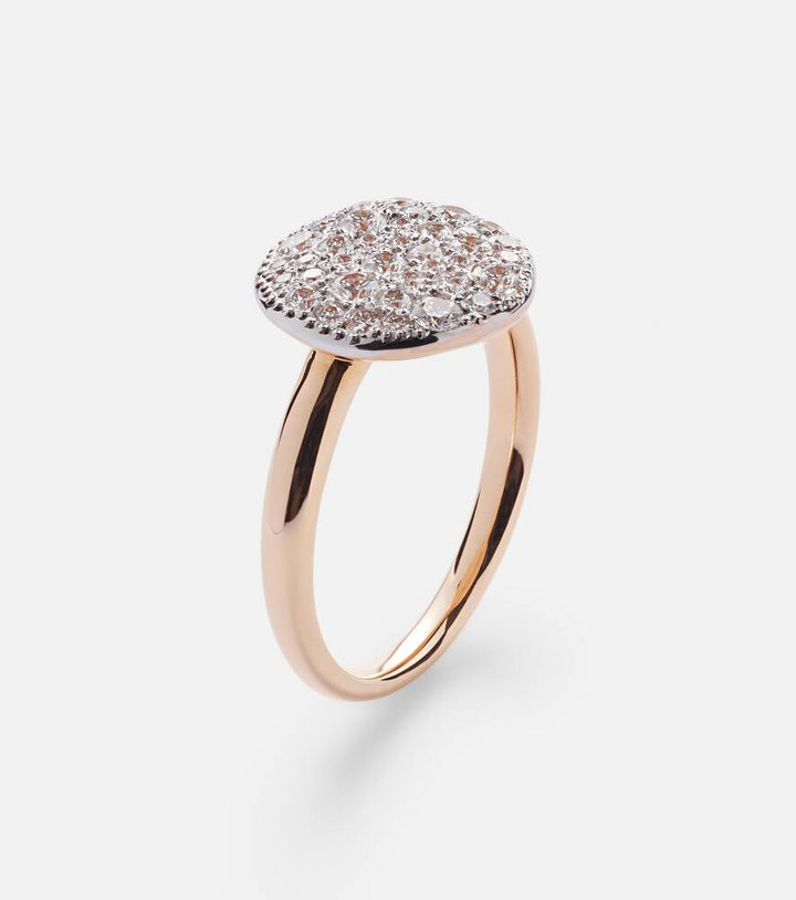 This Sabbia 18kt yellow gold ring with diamonds by Pomellato is a magnificent and opulent statement piece. Made in Italy from 18kt rose gold, this ring is a breathtaking masterpiece, featuring a total carat weight of 0.69 of diamonds that shine like specs of sand sparkling in the sun. The design is a celebration of a sophisticated and graceful style and is perfect for adding high-end sparkle to any ensemble.