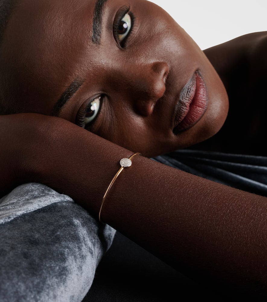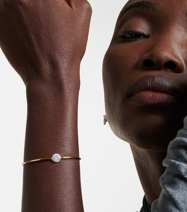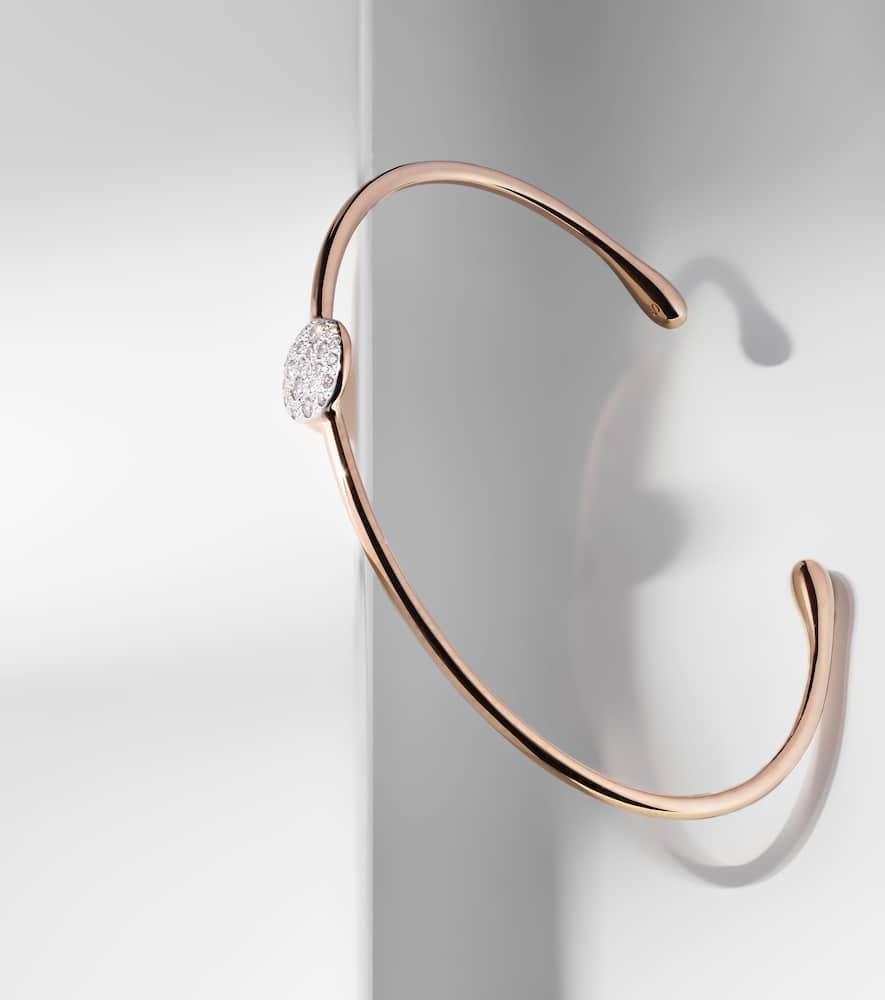 This Sabbia 18kt gold bracelet with diamonds by Pomellato is a magnificent and opulent statement. Made in Italy from 18kt rose gold, this bracelet is a breathtaking masterpiece, featuring a total carat weight of 0.23 of brilliant diamonds. The design is a celebration of a sophisticated and graceful style and is perfect for adding a touch of high-end glamour to your look. It can be worn on its own for a subtle statement or layered with other bracelets for a bolder, more personalized style.