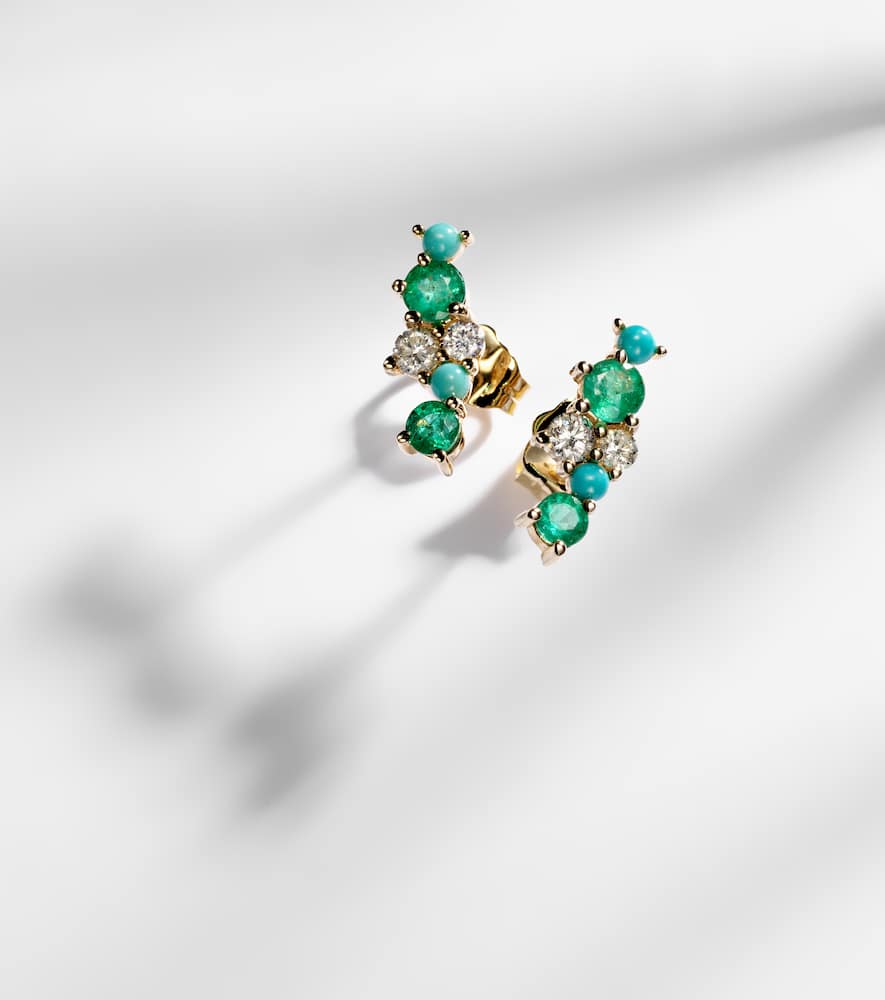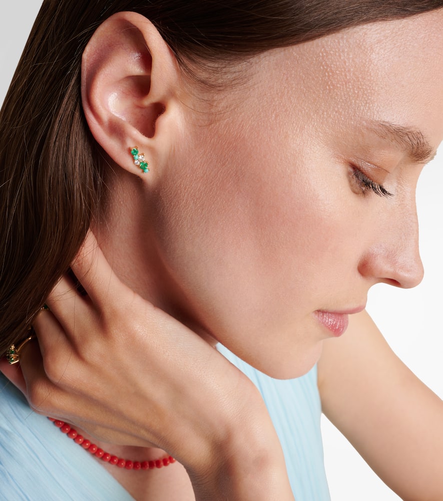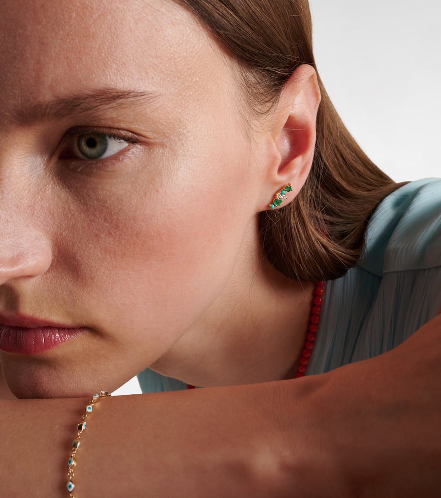 These earrings are made in Hong Kong from 14kt yellow gold with a butterfly-back fastening. They feature 0.18 carats of brilliant-cut diamonds and 0.47 carats of round-cut emeralds in a prong setting. They have a length of 8mm (0.3") and a max width of 5mm (0.2").
