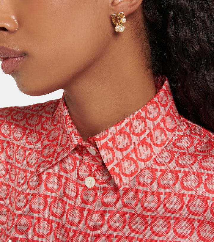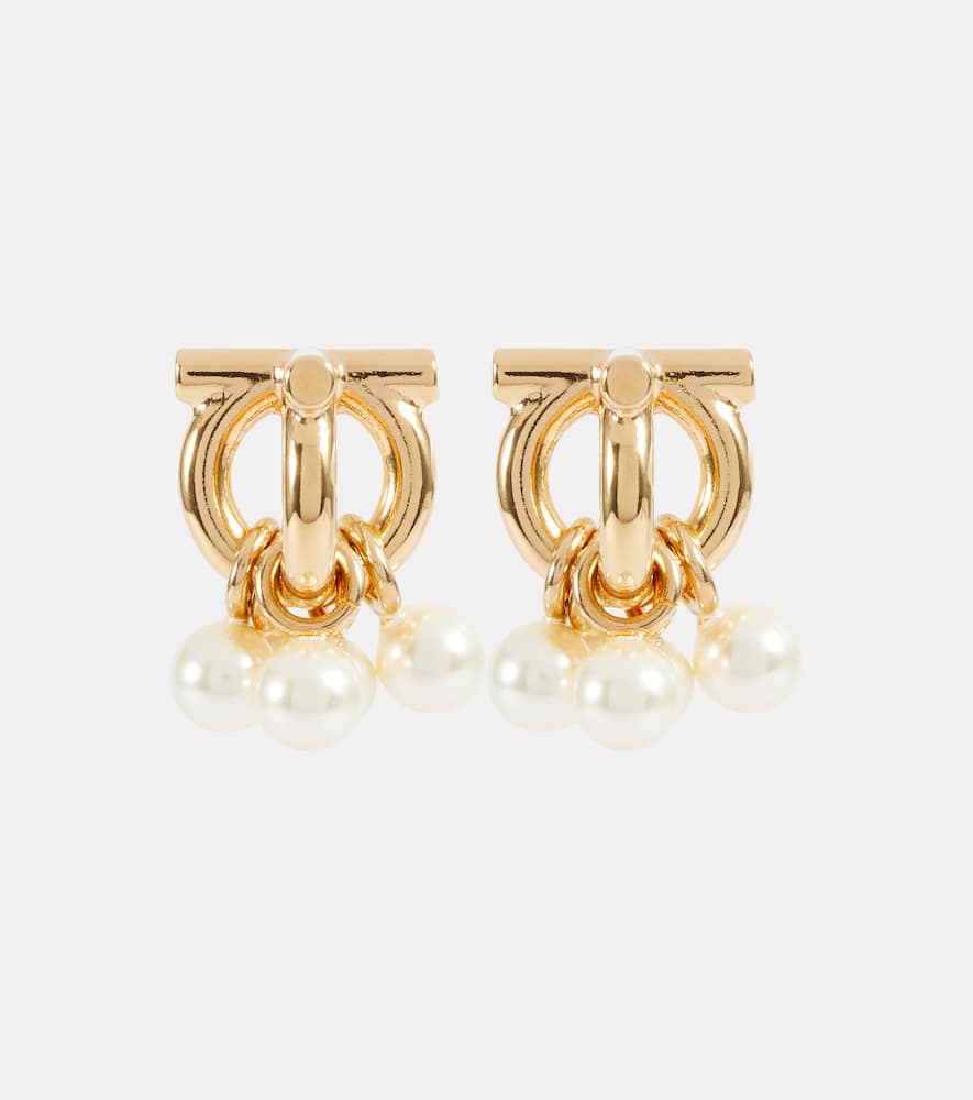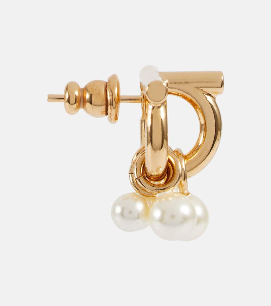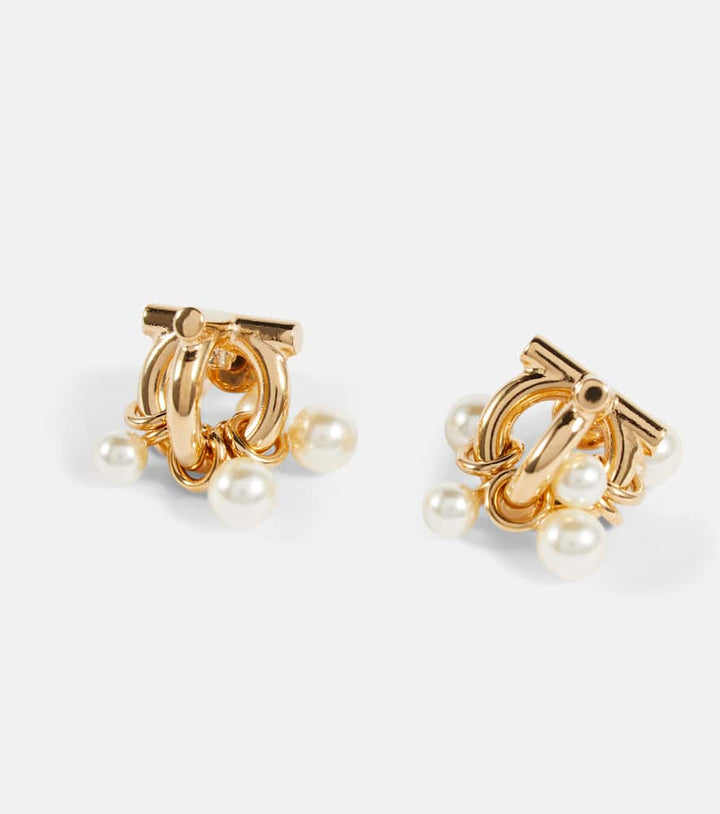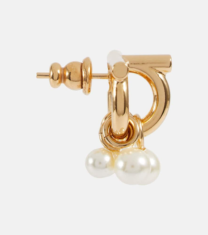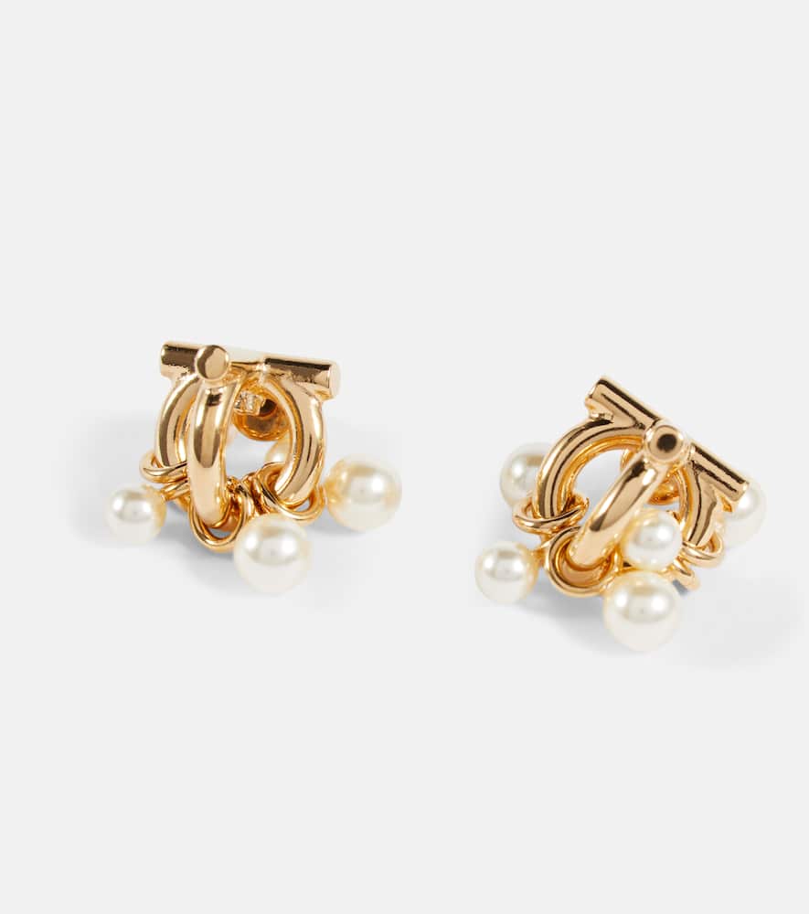 These Gancini Dancing Pearl earrings by Ferragamo are a modern and minimalist piece. Made in Italy from brass and glass, these earrings feature the prominent Gancini logo design with faux pearls. The design is a beautiful blend of a timeless aesthetic and modern luxury, perfect for adding a touch of refined style to your daily look. They are a versatile staple that you will love for years to come.
