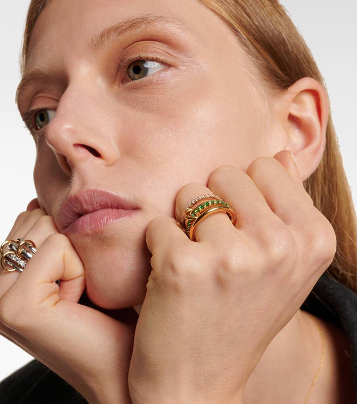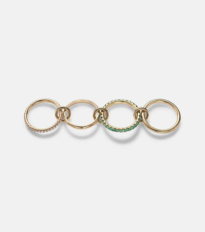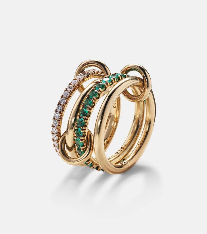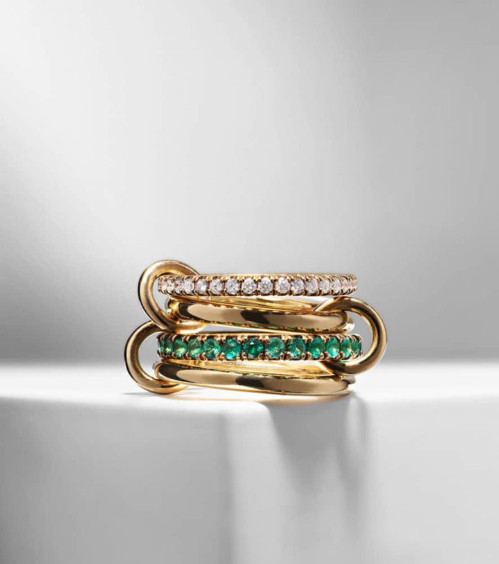 This Halley set of four 18kt gold rings with emeralds and diamonds by Spinelli Kilcollin is a magnificent and opulent statement piece. Made in the USA from 18kt yellow gold, this ring set is a breathtaking masterpiece, featuring a stunning array of emeralds and diamonds. The design is a celebration of a sophisticated and graceful style and is perfect for adding high-end sparkle to any ensemble.