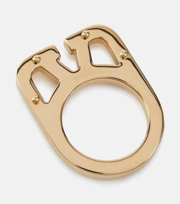 This VLogo Signature ring by Valentino is a bold and striking statement piece. Made in Italy from brass, this ring features the prominent VLogo design. The design is a celebration of a confident and fearless approach to style and is perfect for adding a touch of high-end drama to your look. It can be worn on its own for a subtle statement or stacked with other rings for a bolder, more personalized style.