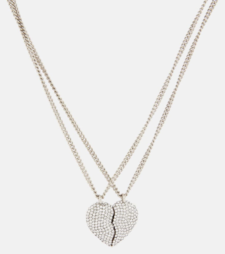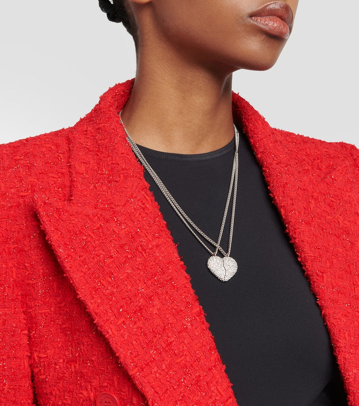 This Lovelock embellished necklace by Balenciaga is a bold and striking statement. Made in Italy from brass and glass, this necklace features a prominent lovelock design with shimmering crystals. The design is a celebration of a confident and fearless approach to style and is perfect for adding a touch of high-end drama to your look. It can be worn on its own for a subtle statement or layered with other pieces for a bolder, more personalized style.