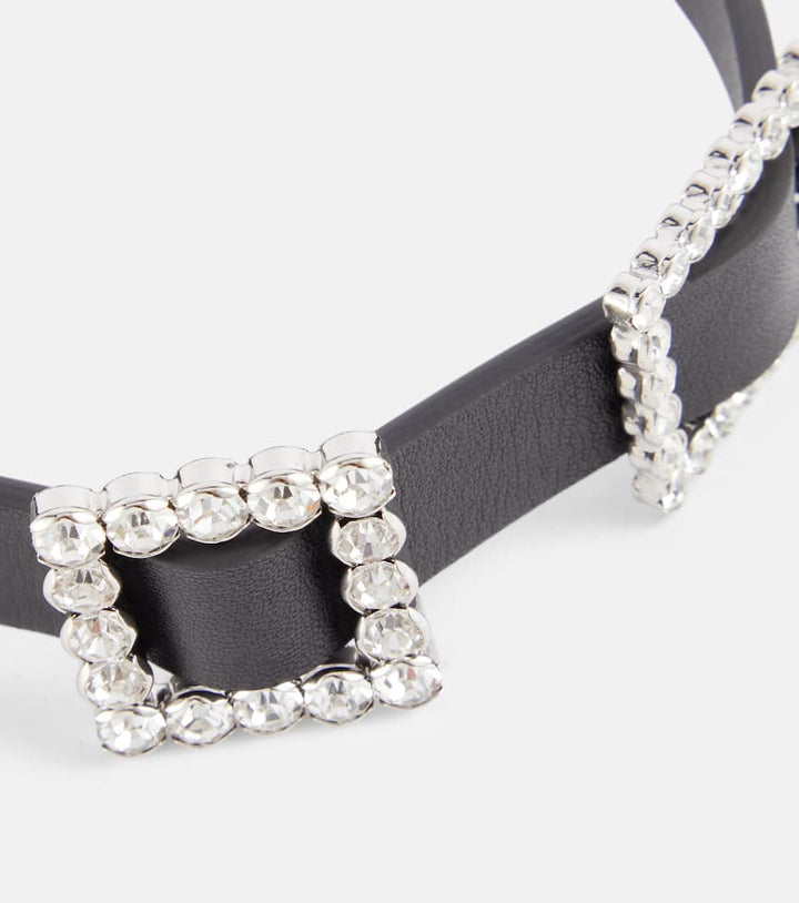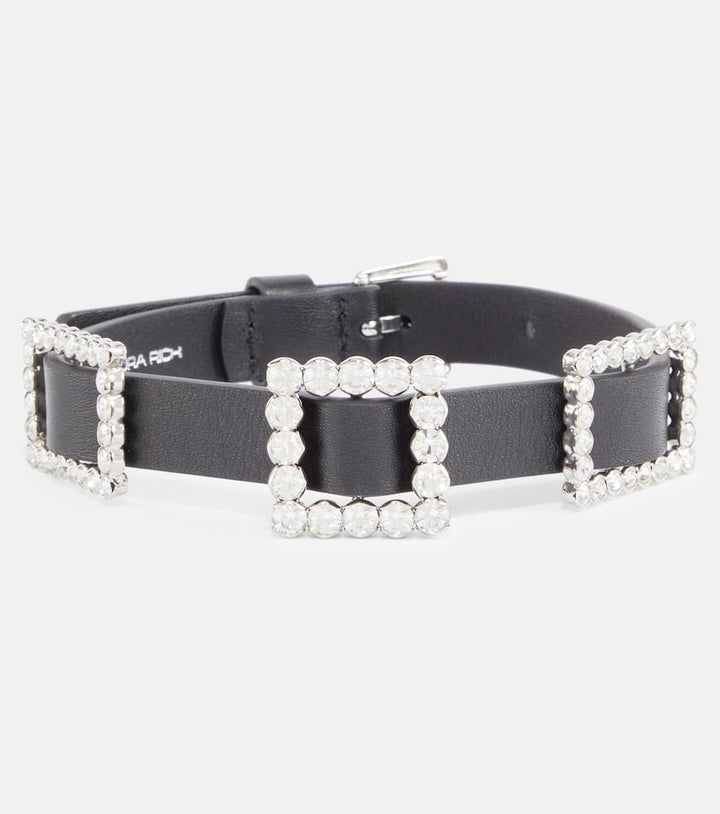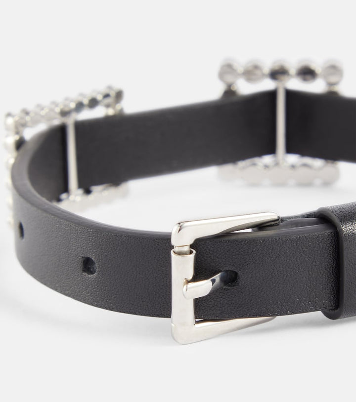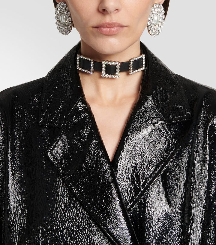 This Embellished leather necklace by Alessandra Rich is a bold and striking statement. Made in Italy from leather, this necklace features a prominent embellished design with crystals. The design is a celebration of a confident and fearless approach to style and is perfect for adding a touch of high-end drama to your look. It can be worn on its own for a subtle statement or layered with other pieces for a bolder, more personalized style.