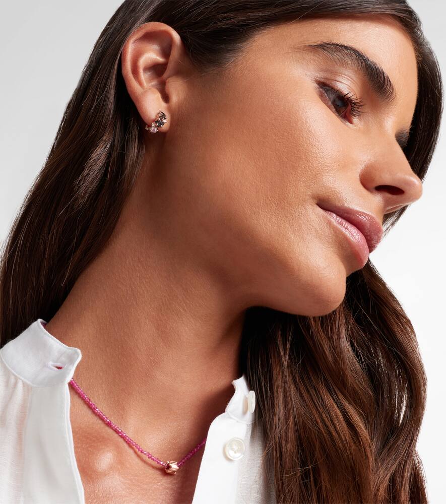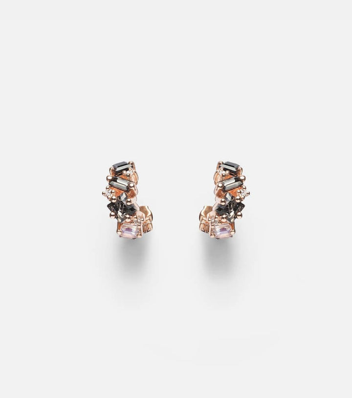 These 14kt rose gold earrings with gemstones and diamonds by Suzanne Kalan are a magnificent and opulent statement. Made in the USA from 14kt rose gold, these earrings are a breathtaking masterpiece, featuring a stunning array of spinel, quartz, and moonstone, with a total carat weight of 0.1 of brilliant white diamonds. The design is a celebration of a sophisticated and graceful style and is perfect for adding a touch of high-end glamour to your look.