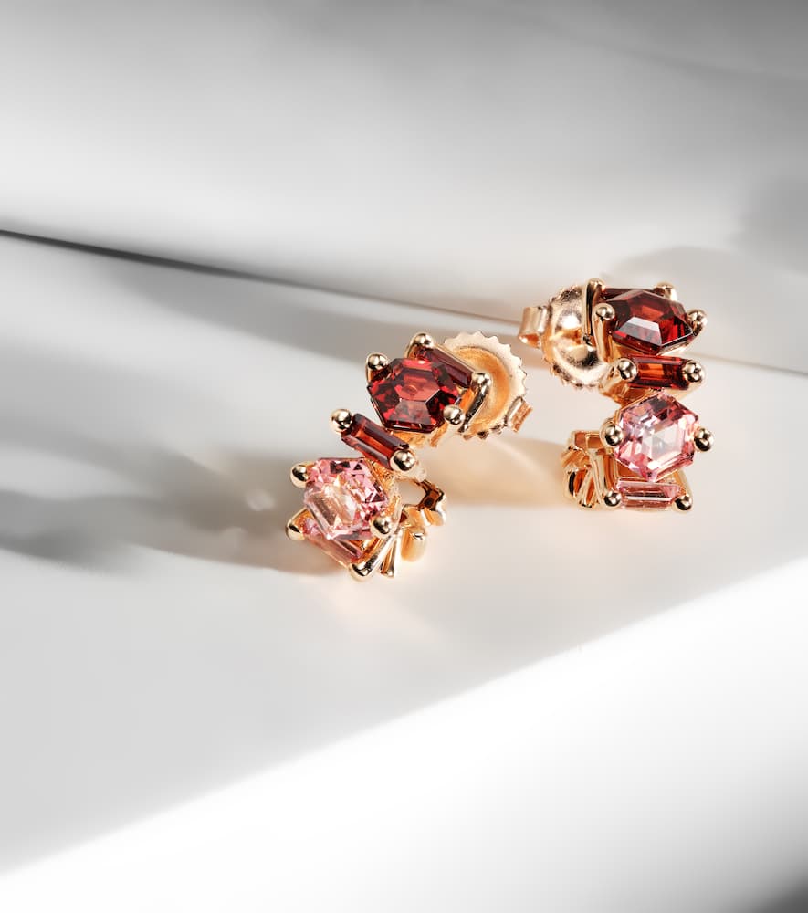These earrings are made in the USA from 14kt rose gold with a butterfly-back fastening. They feature garnet and topaz and are for pierced ears. They have a length of 15mm (0.6") and a max width of 7mm (0.3").