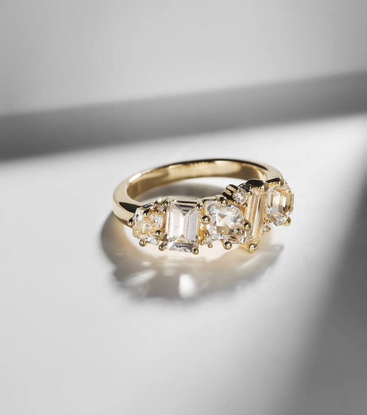 This Nadima Glimmer 14kt gold ring with diamonds and topaz by Suzanne Kalan is a magnificent and opulent statement piece. Made in the USA from 14kt yellow gold, this ring is a breathtaking masterpiece, featuring a stunning array of brilliant white diamonds with a total carat weight of 0.06 and topaz. The design is a celebration of a sophisticated and graceful style and is perfect for adding high-end sparkle to any ensemble.