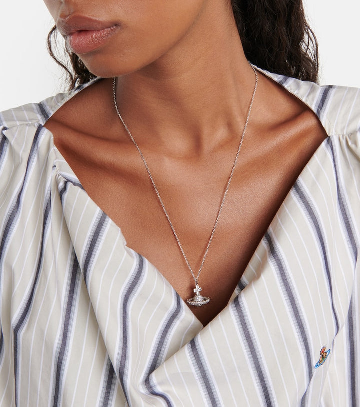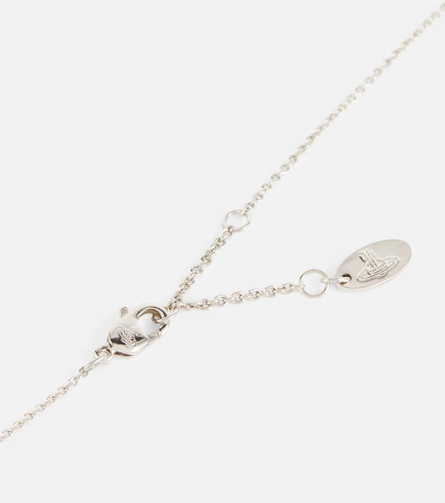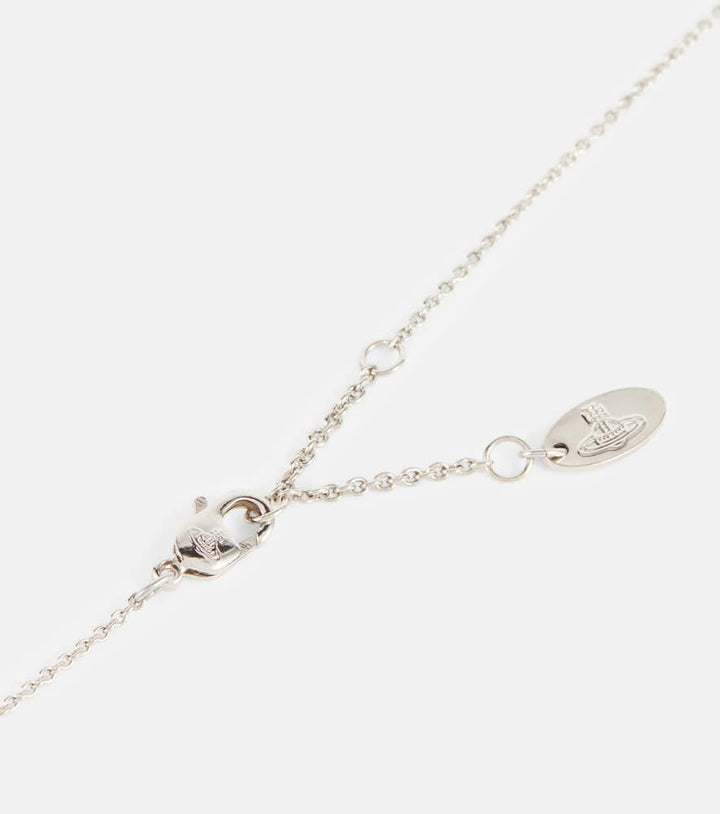 This Grace Small necklace by Vivienne Westwood is a bold and striking statement. Made in Italy from brass and glass, this necklace features a prominent orb design with shimmering crystals. The design is a celebration of a confident and fearless approach to style and is perfect for adding a touch of high-end drama to your look. It can be worn on its own for a subtle statement or layered with other pieces for a bolder, more personalized style.
