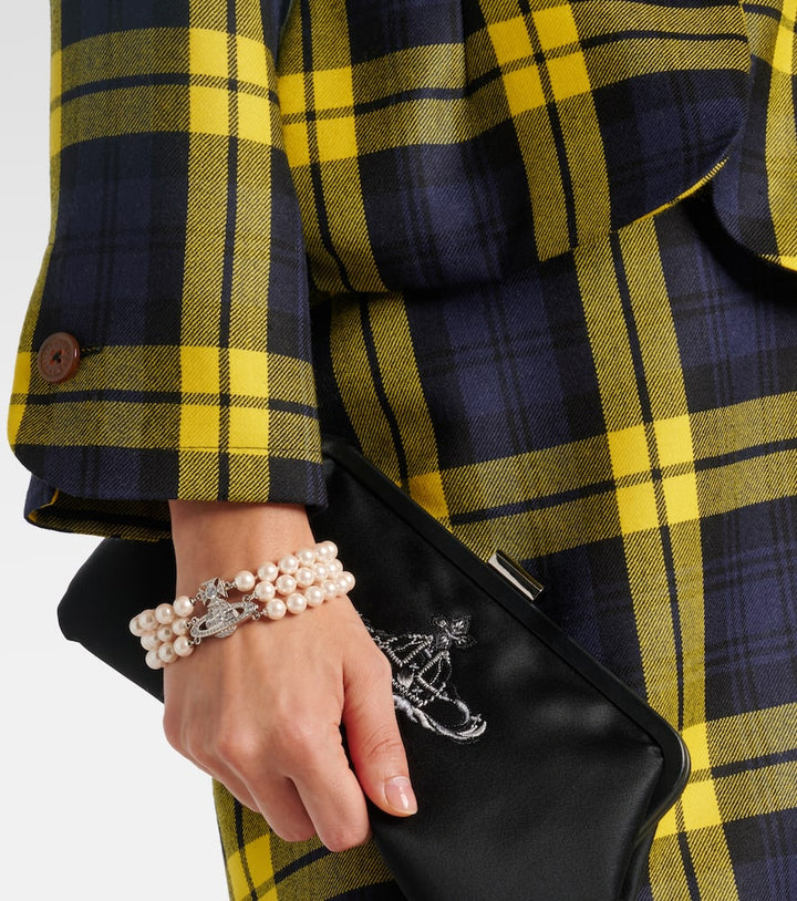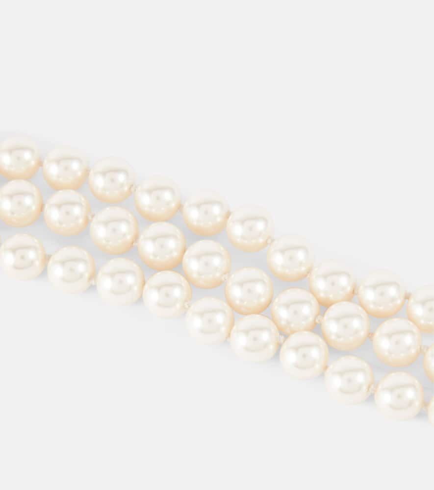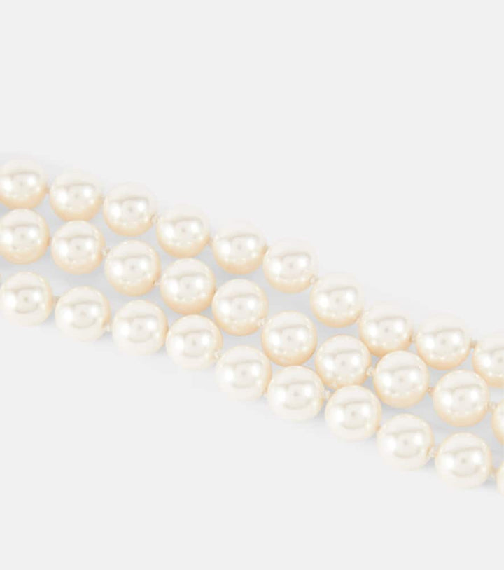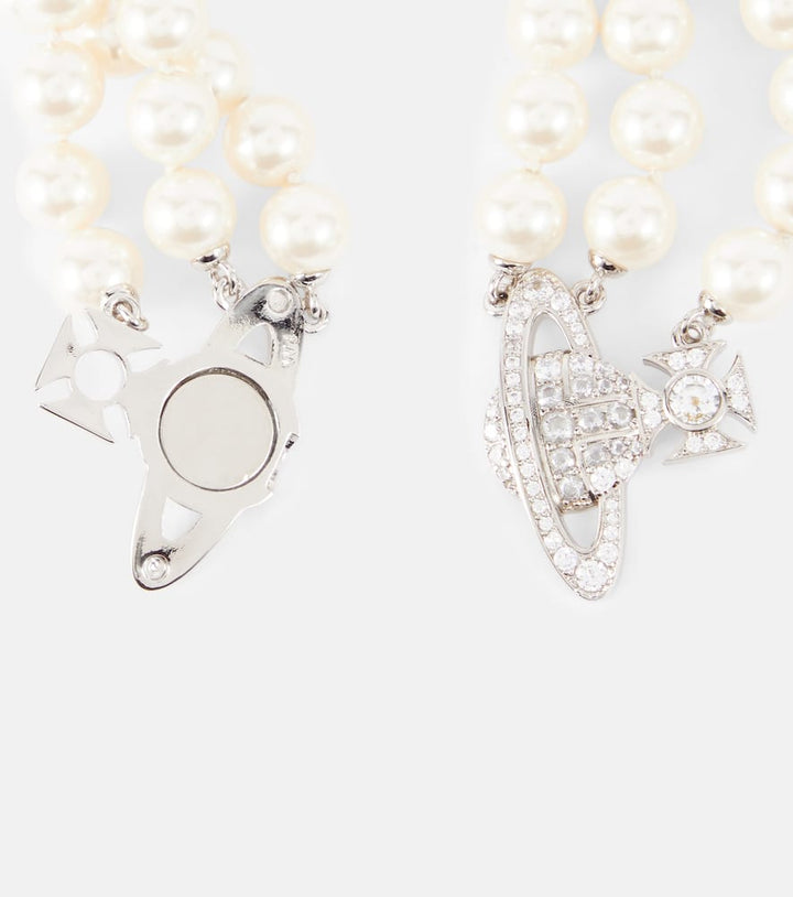 This Graziella embellished faux pearl bracelet by Vivienne Westwood is a bold and striking statement. Made in Thailand from brass and faux pearls, this bracelet features a prominent design with faux pearls and shimmering crystals. The design is a celebration of a confident and fearless approach to style and is perfect for adding a touch of high-end drama to your look. It can be worn on its own for a subtle statement or layered with other bracelets for a bolder, more personalized style.