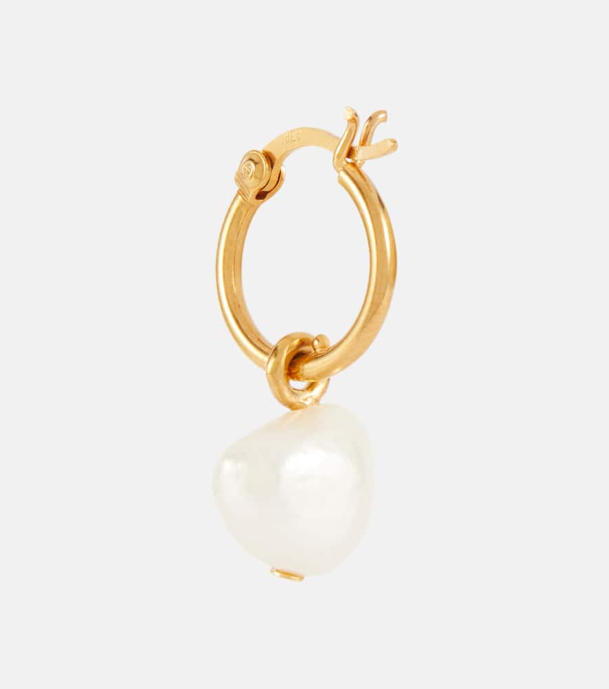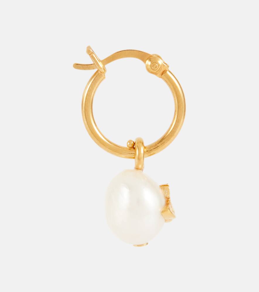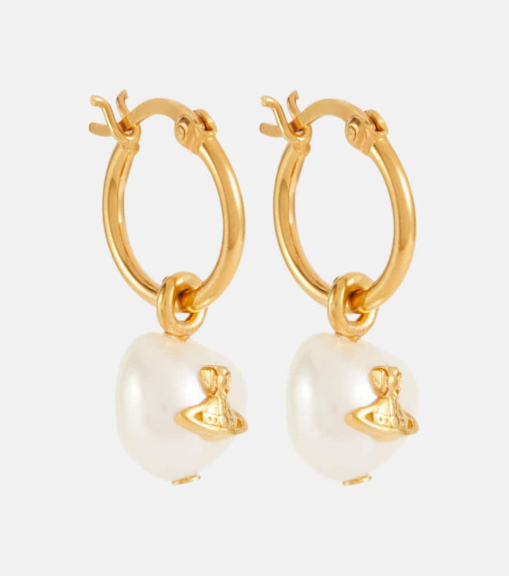 These Azul silver hoop earrings by Vivienne Westwood are a modern and minimalist piece. Made in Thailand from gold-plated sterling silver and faux pearls, these earrings feature a sleek hoop design. The design is a beautiful blend of a timeless aesthetic and modern luxury, perfect for adding a touch of refined style to your daily look. They are a versatile staple that you will love for years to come.