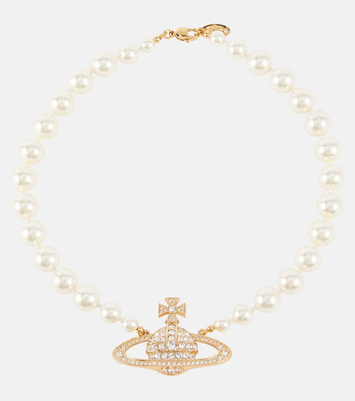 This Orb embellished choker by Vivienne Westwood is a bold and striking statement. Made in Thailand from brass and artificial pearls, this choker features a prominent orb design with shimmering crystals, surrounded by faux pearls. The design is a celebration of a confident and fearless approach to style and is perfect for adding a touch of high-end drama to your look. It can be worn on its own for a subtle statement or layered with other pieces for a bolder, more personalized style.
