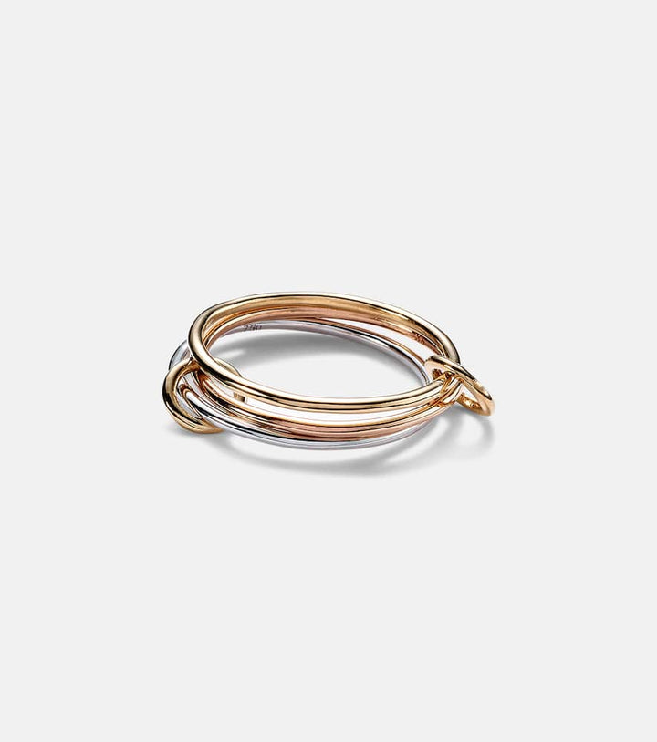 This Cyllene MX 18kt yellow, rose, and white gold rings by Spinelli Kilcollin are a magnificent and opulent statement piece. Made in the USA from 18kt yellow, rose, and white gold, this piece is a breathtaking masterpiece, featuring three linked rings. The design is a celebration of a sophisticated and graceful style and is perfect for adding high-end sparkle to any ensemble. It can be worn on its own for a subtle statement or stacked with other rings for a bolder, more personalized style.
