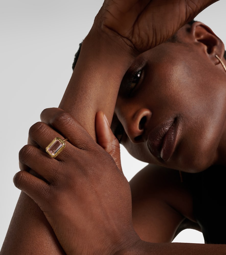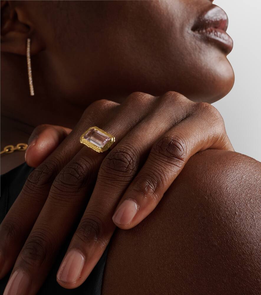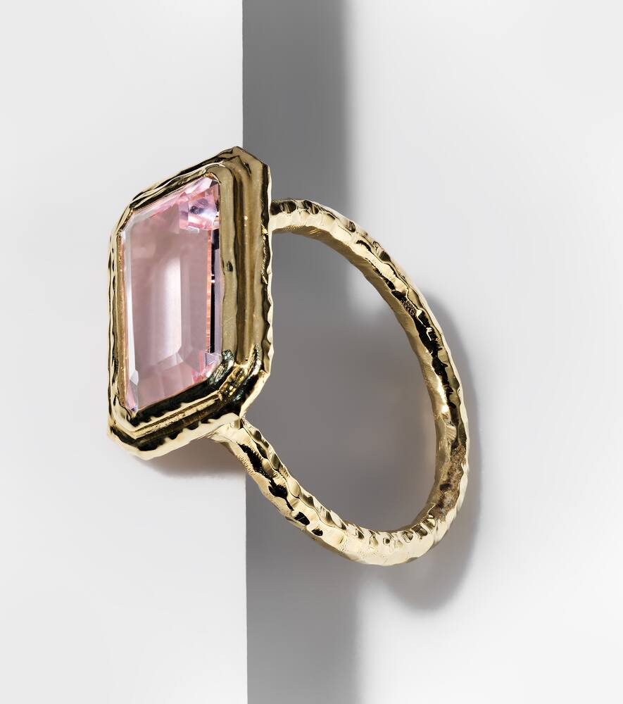 This Elbow Beach 18kt gold ring with morganite by Octavia Elizabeth is a magnificent and opulent statement piece. Made in the USA from 18kt yellow gold, this ring is a breathtaking masterpiece, featuring a stunning emerald-cut morganite totaling 2.2 carats. The design is a celebration of a sophisticated and graceful style and is perfect for adding high-end sparkle to any ensemble. It can be worn on its own for a subtle statement or stacked with other rings for a bolder, more personalized style.