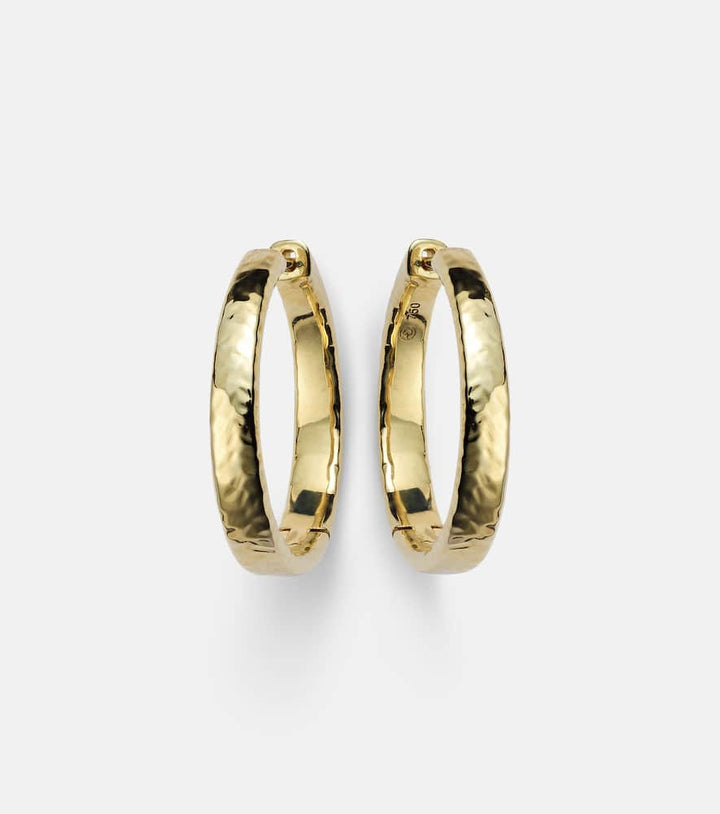 These earrings are handmade in the USA from 18kt gold. They have a hinge closure and are for pierced ears. They have a length of 24mm (0.95"), a width of 4mm (0.15"), and a diameter of 24mm (0.95").