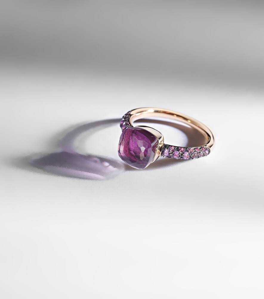 This Nudo Petit 18kt rose and white gold ring with amethyst and jade by Pomellato is a magnificent and opulent statement piece. Made in Italy from 18kt rose and white gold, this ring is a breathtaking masterpiece, featuring a stunning array of amethyst and jade. The design is a celebration of a sophisticated and graceful style and is perfect for adding high-end sparkle to any ensemble. It can be worn on its own for a subtle statement or stacked with other rings for a bolder, more personalized style.