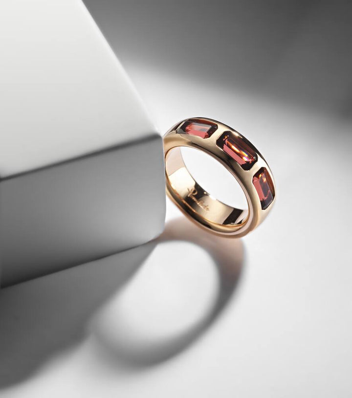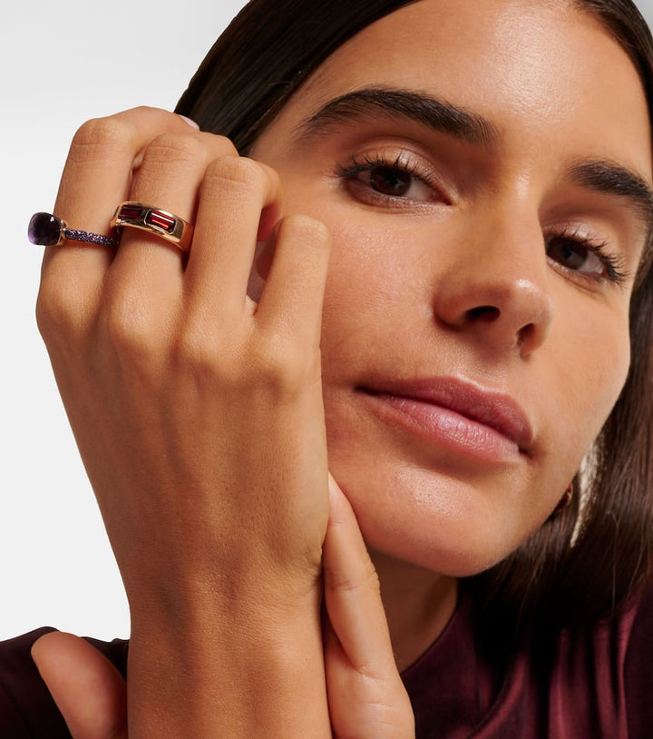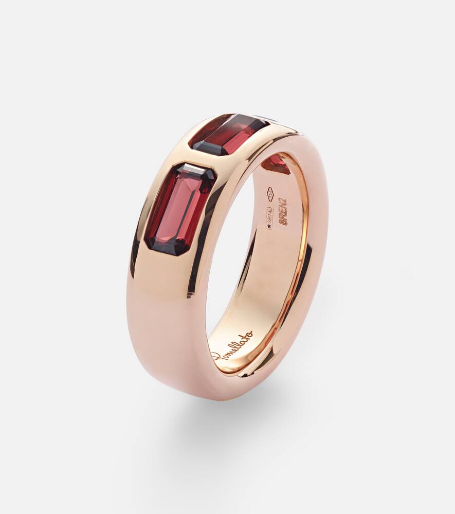 This Iconica 18kt rose gold ring with pyrope garnets by Pomellato is a magnificent and opulent statement piece. Made in Italy from 18kt rose gold, this ring is a breathtaking masterpiece, featuring a stunning array of pyrope garnets. The design is a celebration of a sophisticated and graceful style and is perfect for adding high-end sparkle to any ensemble. It can be worn on its own for a subtle statement or stacked with other rings for a bolder, more personalized style.