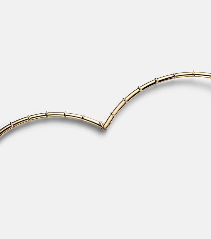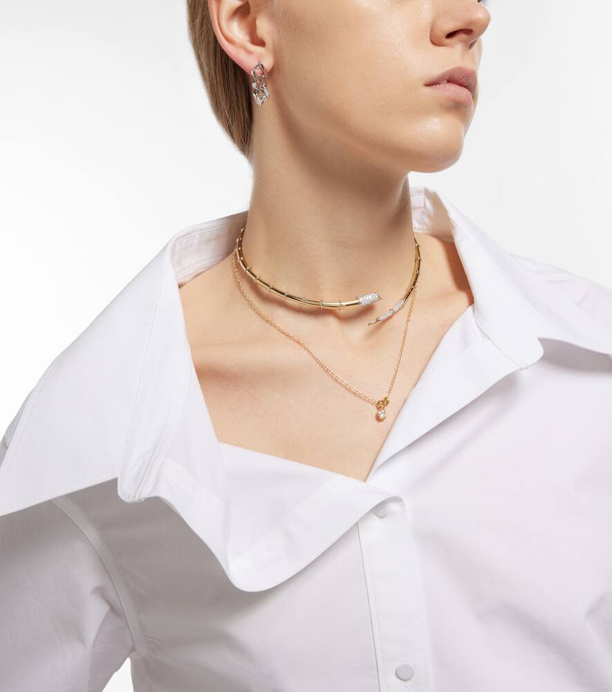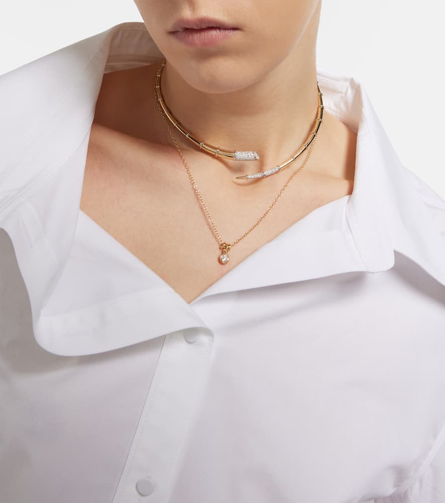 This Horn 14kt gold necklace with diamonds by Rainbow K is a magnificent and opulent statement. Made in Greece from 14kt yellow gold, this necklace is a breathtaking masterpiece, featuring a stunning array of brilliant diamonds. The design is a celebration of a sophisticated and graceful style and is perfect for adding a touch of high-end glamour to your look. It can be worn on its own for a subtle statement or layered with other pieces for a bolder, more personalized style.
