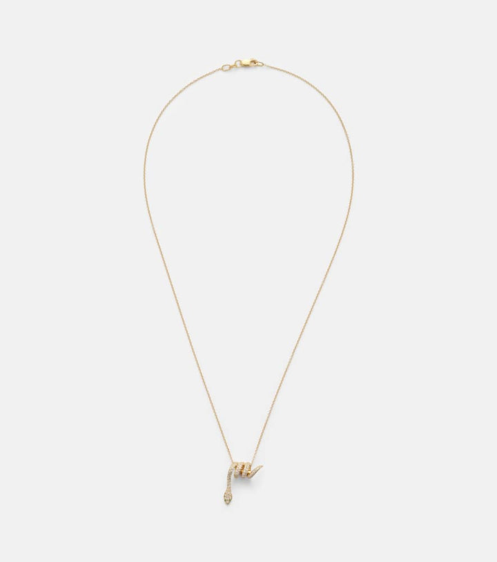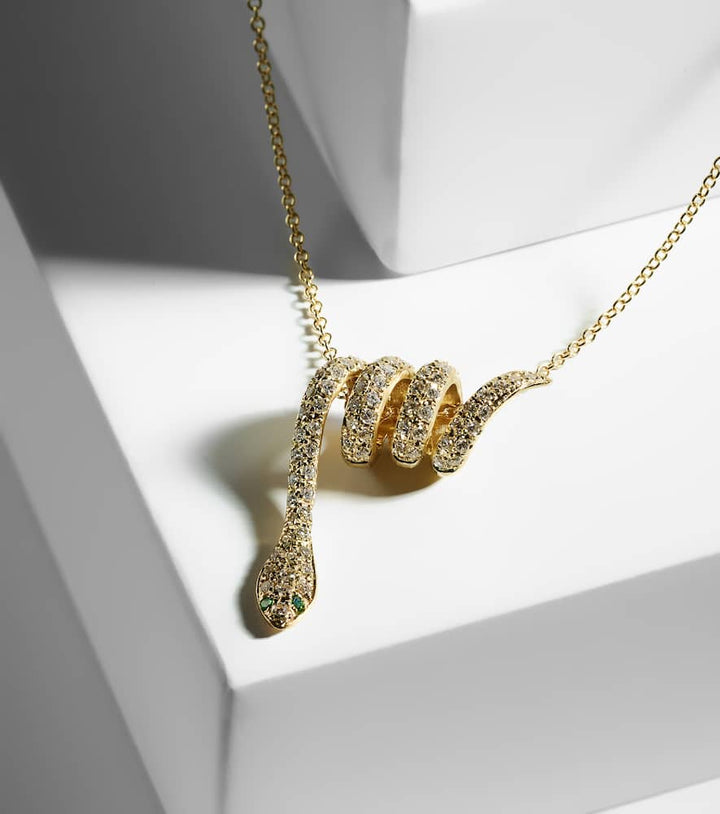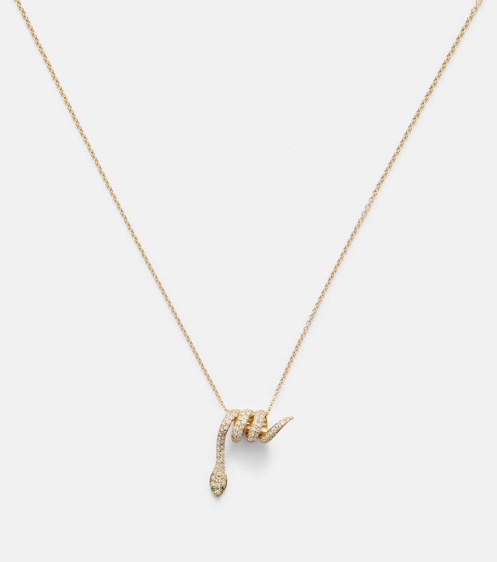This Convolute Snake 18kt gold necklace with gemstones by Ileana Makri is a magnificent and opulent statement. Made in Greece from 18kt yellow gold, this necklace is a breathtaking masterpiece, featuring a total carat weight of 0.49 of brilliant diamonds and 0.02 of tsavorites. The design is a celebration of a sophisticated and graceful style and is perfect for adding a touch of high-end glamour to your look. It can be worn on its own for a subtle statement or layered with other pieces for a bolder, more personalized style.