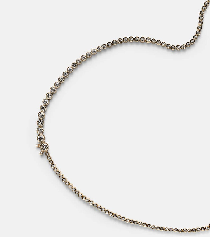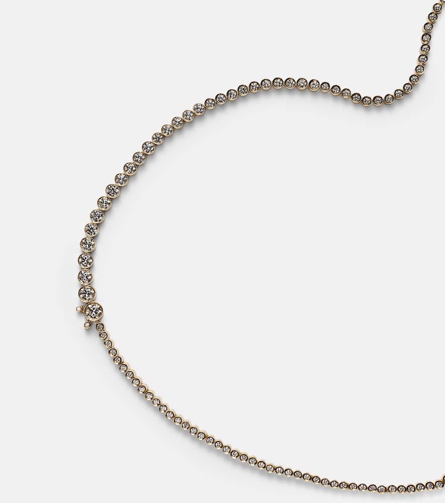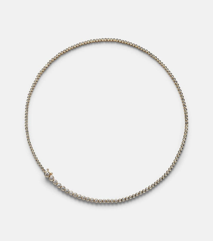 This Collier De Tennis 18kt gold necklace with diamonds by Sophie Bille Brahe is a modern take on a classic tennis necklace. It features a stunning, continuous line of round-cut diamonds, each meticulously set in a bezel setting, creating a smooth and delicate look. The 18kt yellow gold chain enhances the brilliance of the diamonds, making it a piece that truly shines. Perfect for layering or wearing on its own, this necklace is an investment in timeless elegance that will be treasured for years to come.