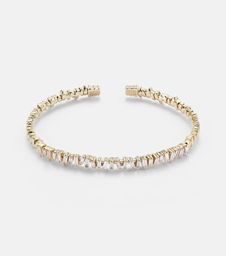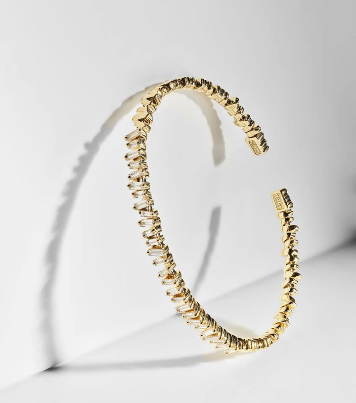 This Classic 18kt gold bangle with diamonds by Suzanne Kalan is a modern and elegant take on a timeless accessory. The bangle is crafted from lustrous 18kt yellow gold and features a series of baguette-cut diamonds in a clean prong setting. This geometric arrangement creates a sleek and sophisticated sparkle that can be worn for any occasion. It is a perfect piece to add to your collection, either to be worn alone for a refined statement or stacked with other bracelets for a personalized style.