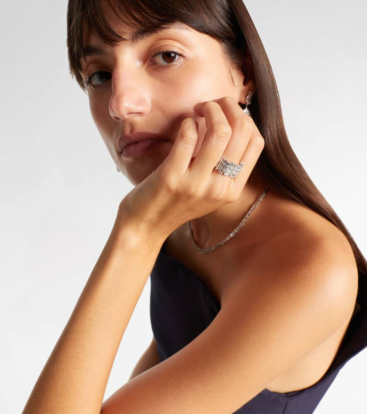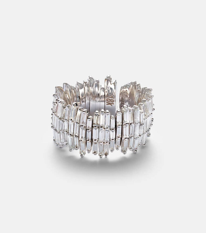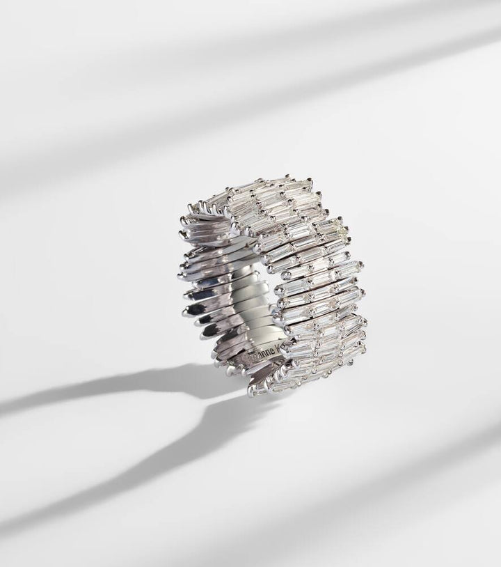 This 18kt white gold ring with diamonds by Suzanne Kalan is a stunning and luxurious statement piece. The ring features a dynamic, multi-band design crafted from 18kt white gold, which is adorned with an impressive arrangement of baguette-cut diamonds in a prong setting. The geometric precision of the diamonds creates a captivating sparkle that is both modern and timeless. It's a perfect ring for a special occasion, symbolizing enduring elegance and sophisticated style.