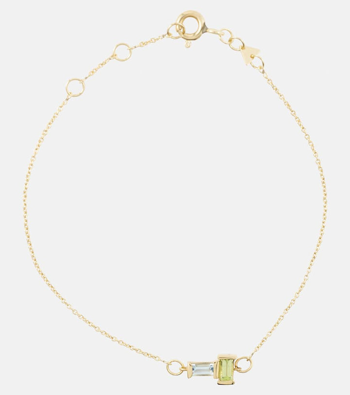 Crafted from 9kt yellow gold, this bracelet features peridot and aquamarine stones. Made in Italy, it has an adjustable length from 15cm (6") to 17cm (6.5") with a pendant width of 8mm (0.3").