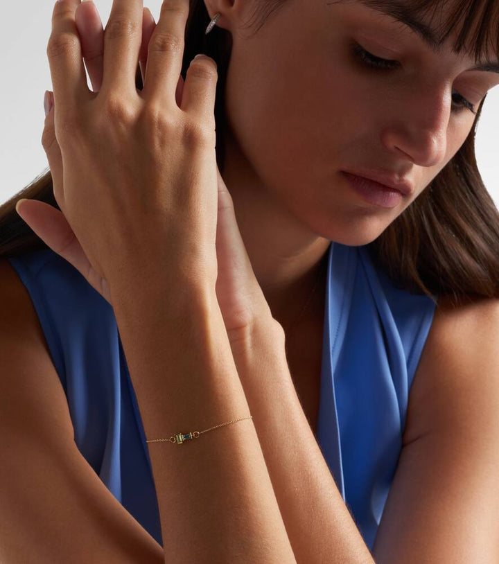 This Tu Y Yo 9kt gold bracelet with gemstones by Aliita is a delicate and meaningful piece. The bracelet features a fine 9kt yellow gold chain adorned with two beautiful gemstones, a serene aquamarine and a vibrant peridot. The "You and I" design symbolizes a cherished connection and deep bond. Its simplicity makes it perfect for everyday wear, adding a touch of personal significance and color to your wrist. It's an ideal gift for a loved one or a meaningful addition to your own collection.
