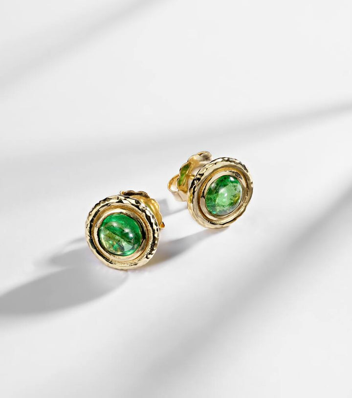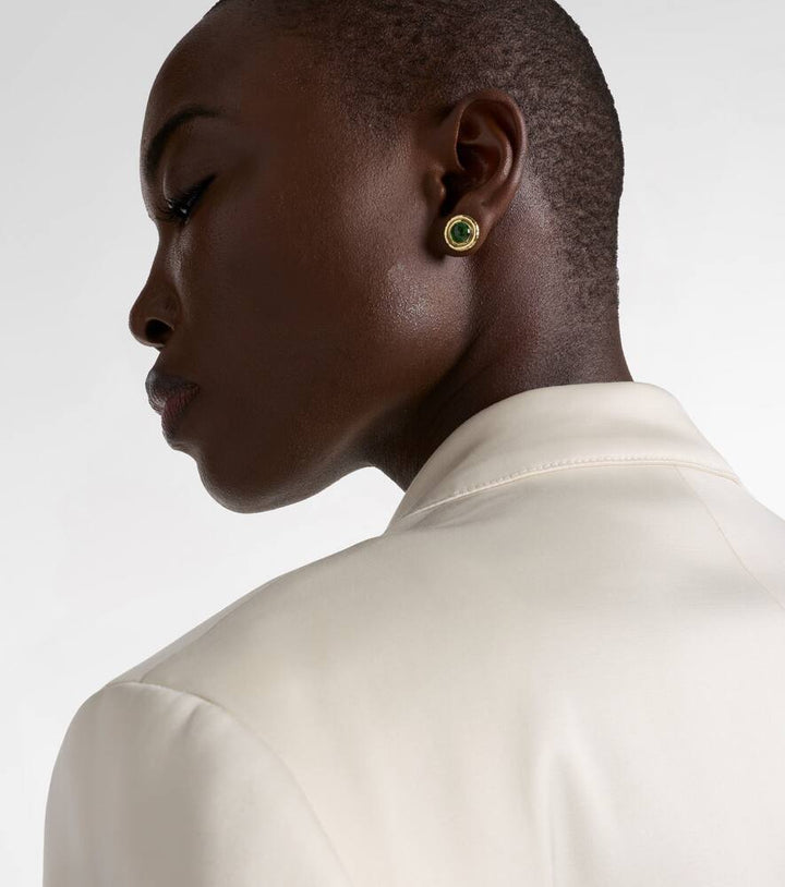 These Palm 18kt gold earrings with tsavorites by Octavia Elizabeth are a bold and captivating statement. The earrings feature a stunning, textured design in 18kt yellow gold, adorned with a vibrant array of tsavorites. The rich green of the tsavorites offers a beautiful contrast to the gold, creating a luxurious and eye-catching look. These earrings are perfect for adding a touch of sophisticated glamour and unique artistic flair to any evening outfit.