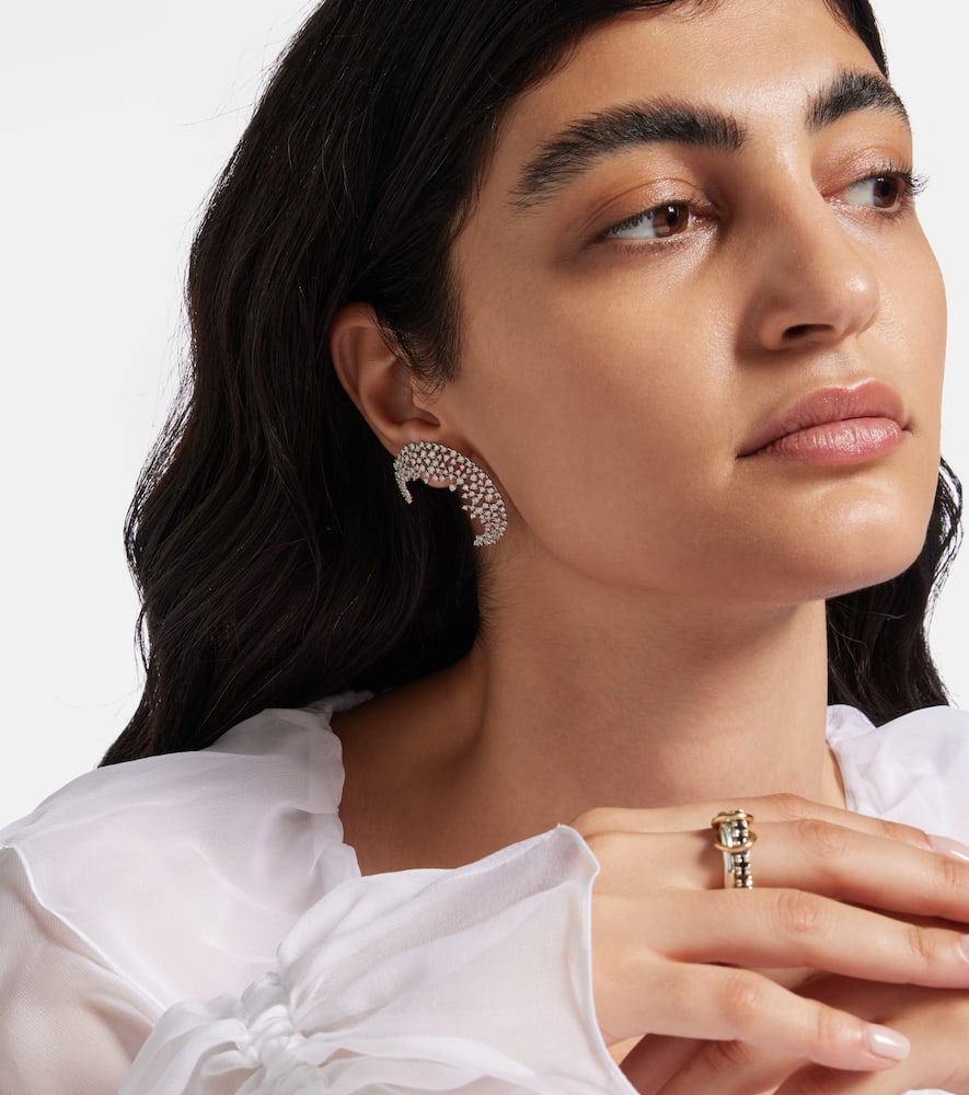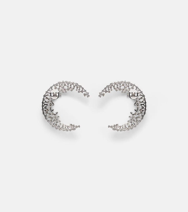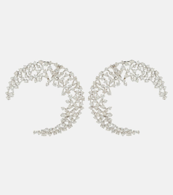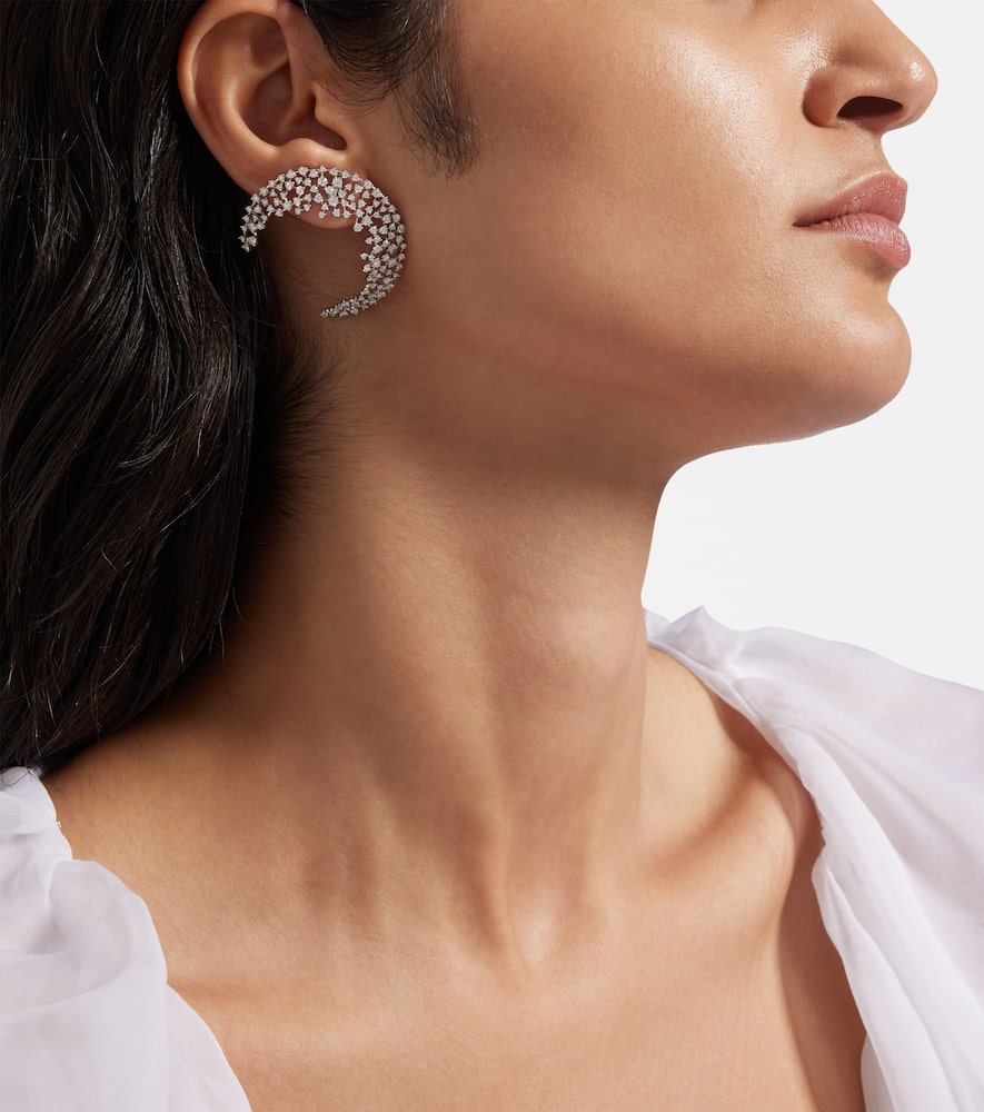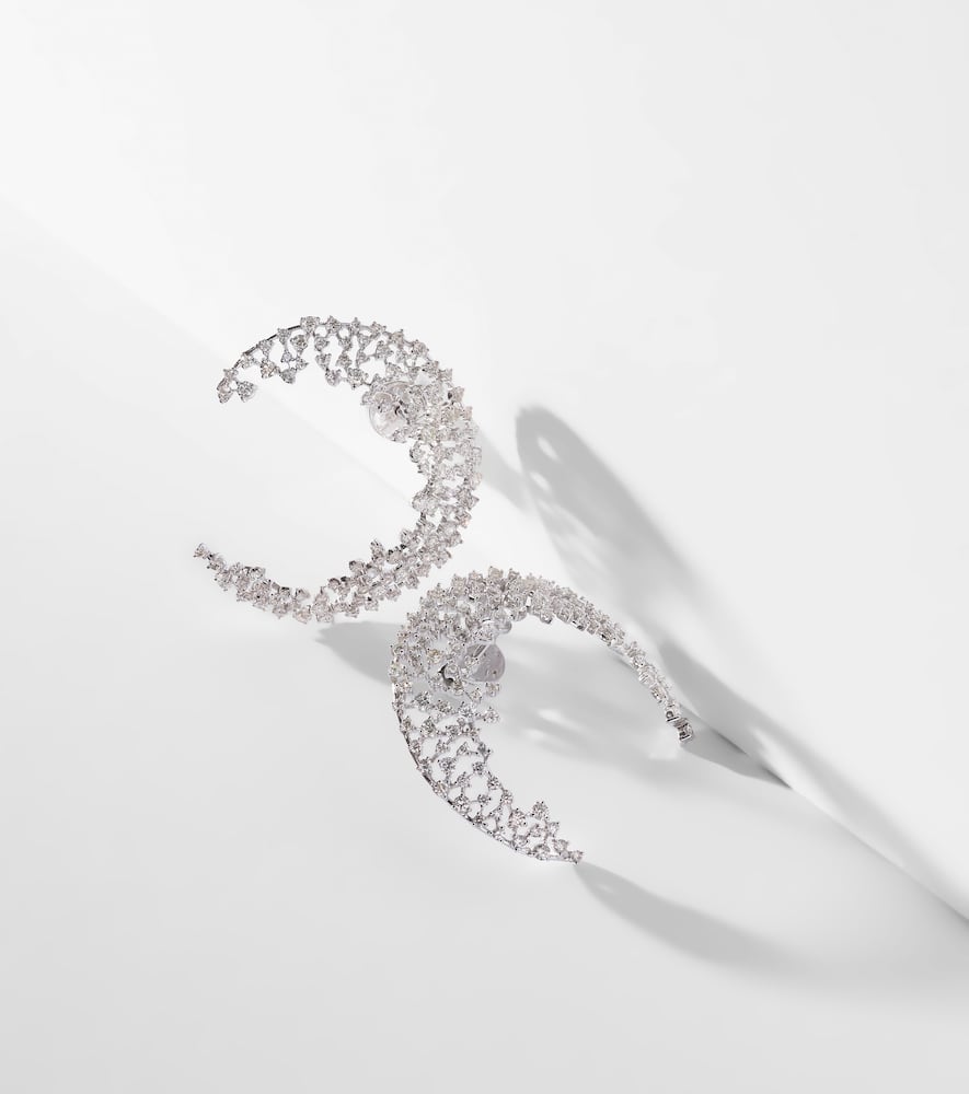 These Scatter Moon 18kt white gold earrings with diamonds by Ananya are a magnificent and opulent statement. The earrings feature a stunning, moon-shaped design in 18kt white gold, completely adorned with a profusion of round-cut diamonds in a prong setting. The intricate design creates a dazzling and luxurious sparkle that captures light from every angle. These earrings are a true testament to artistry and opulence, perfect for a special occasion where you want to make a lasting impression.