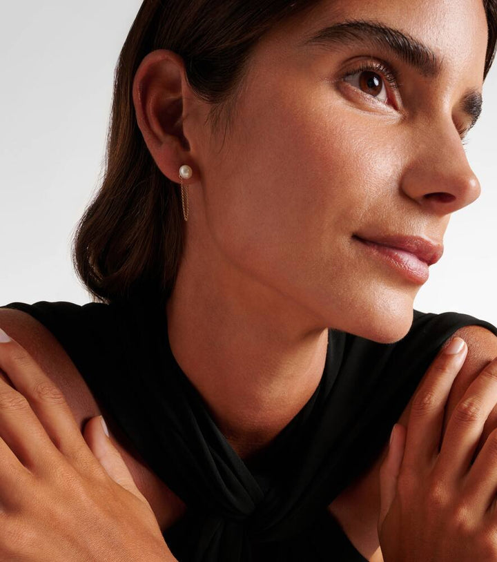 Crafted from 14kt yellow gold, these earrings feature freshwater cultivated pearls (Hyriopsis Cumingii, farmed in China). Made in the USA, they have a butterfly-back fastening and measure 30mm (1.2") in length with a max. width of 6mm (0.25").