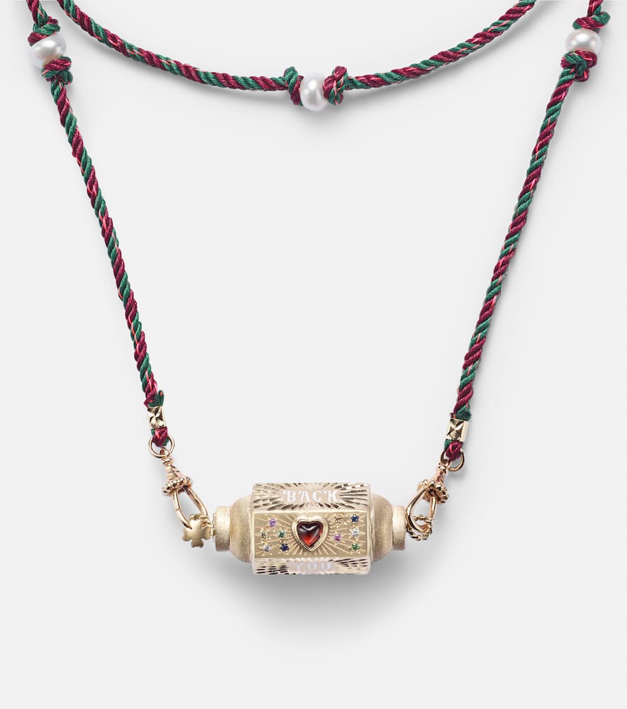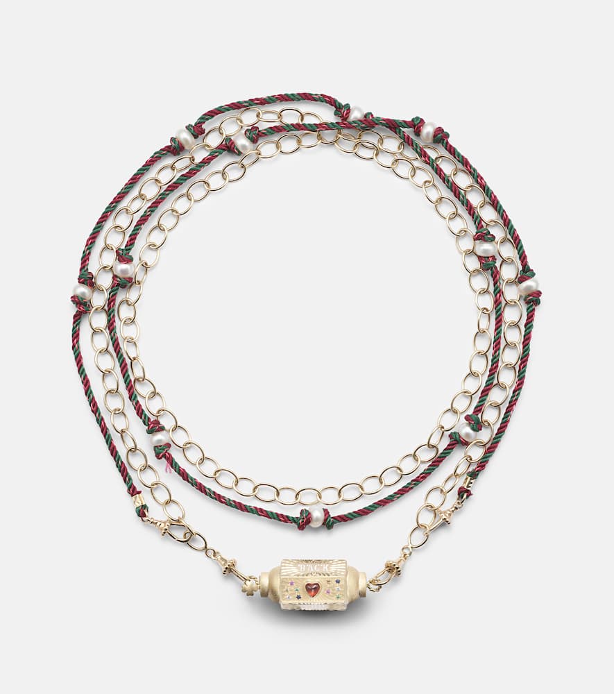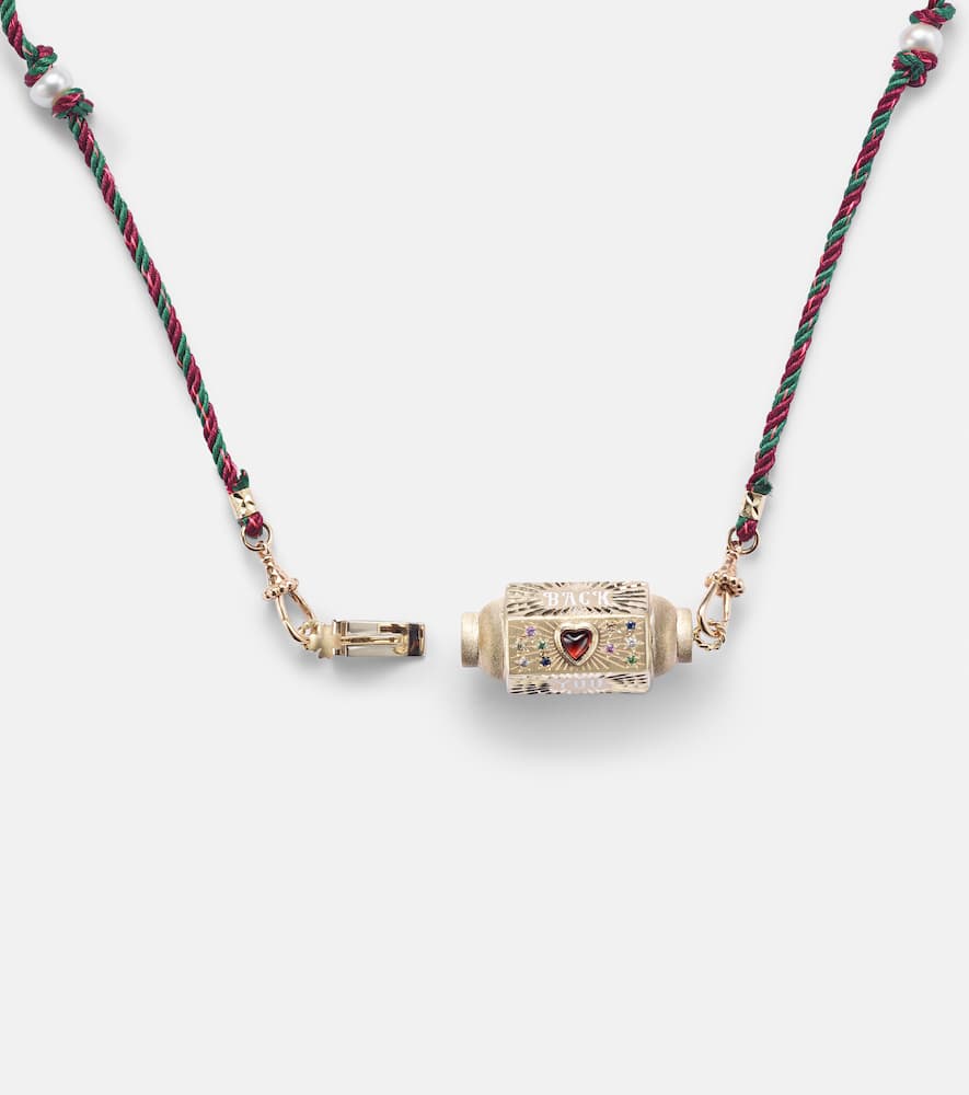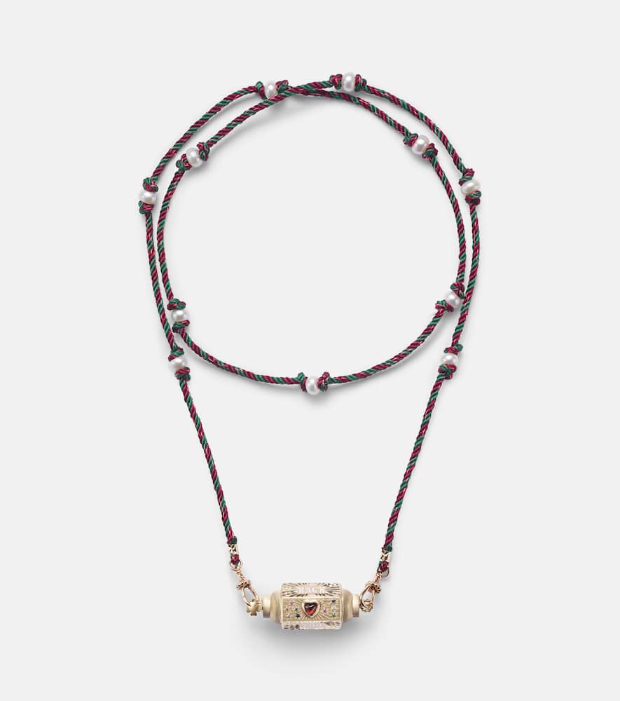 Crafted from 14kt yellow gold and enamel, this handmade necklace features a round-cut, flush-set sapphire. Made in Italy, it has a detachable rope/cable chain and cord. The locket measures 15mm (0.6") in length and 40mm (1.55") in width, and the necklace has an open length of 72cm (28.5") with a max. width of 5mm (0.2").