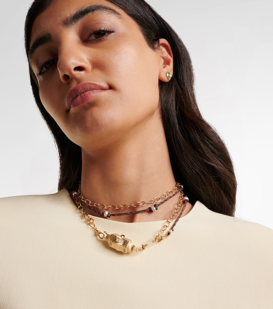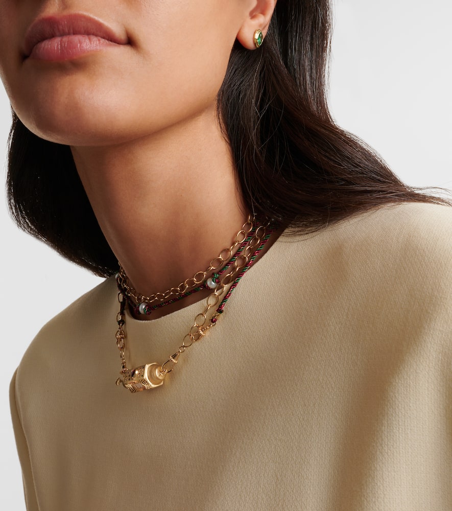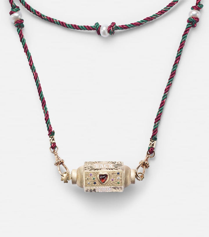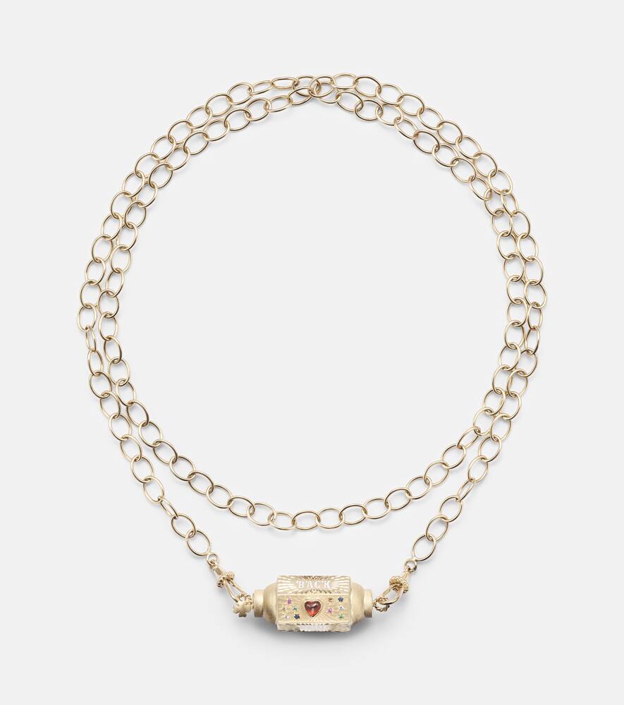 Crafted from 14kt yellow gold and enamel, this handmade necklace features a round-cut, flush-set sapphire. Made in Italy, it has a detachable rope/cable chain and cord. The locket measures 15mm (0.6") in length and 40mm (1.55") in width, and the necklace has an open length of 72cm (28.5") with a max. width of 5mm (0.2").