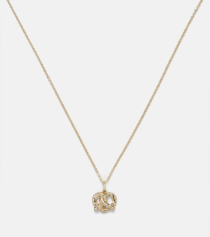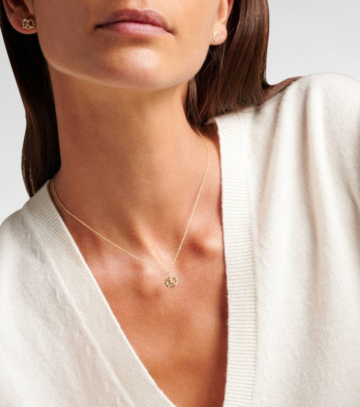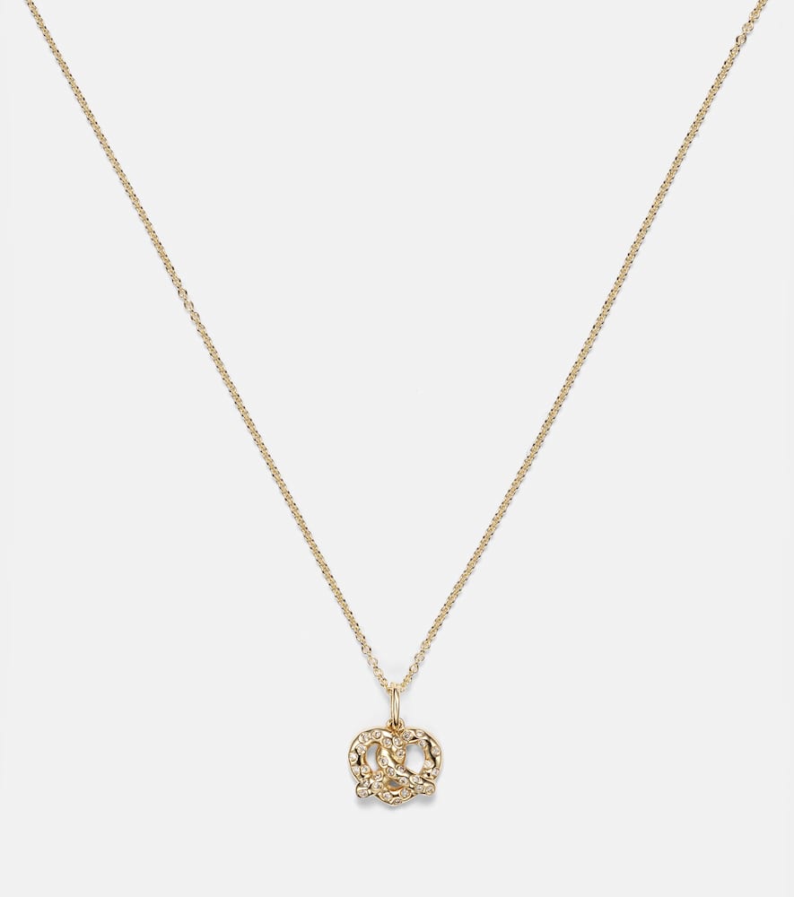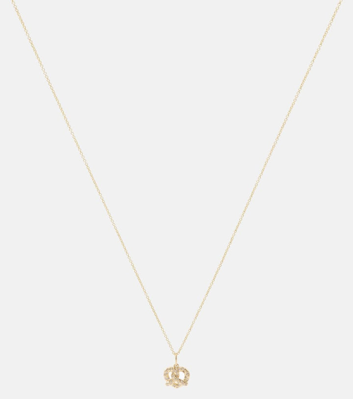 This Pretzel 14kt gold charm necklace with diamonds by Sydney Evan is a delightful and whimsical accessory. The necklace features a charming pretzel-shaped pendant, adorned with shimmering diamonds, suspended from a delicate 14kt yellow gold chain. This playful design is both unique and luxurious, perfect for adding a touch of personal flair and lighthearted style to your look. It's a fun yet sophisticated piece that celebrates life's small joys.