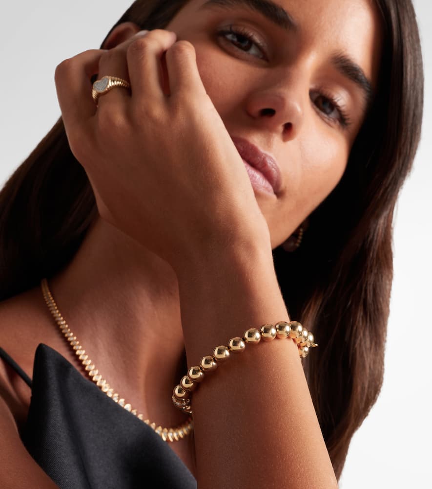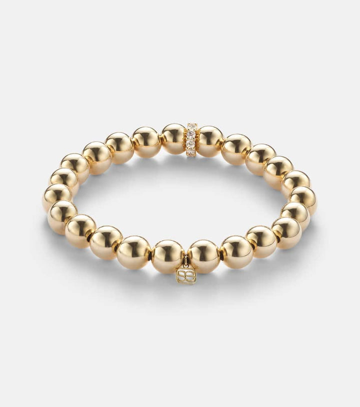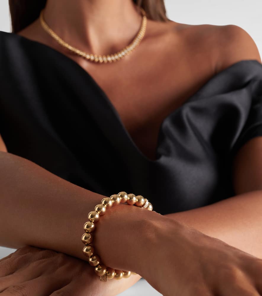 This Cocktail 14kt gold beaded bracelet with diamonds by Sydney Evan is a vibrant and luxurious statement. The bracelet features an elasticated band of smooth 14kt yellow gold beads, which beautifully contrasts with the brilliance of the diamonds. The bold design and comfortable fit make it a perfect accessory for adding a touch of sophisticated glamour to your wrist stack. It's a versatile piece that can be worn alone or with other bracelets for a personalized, opulent look.