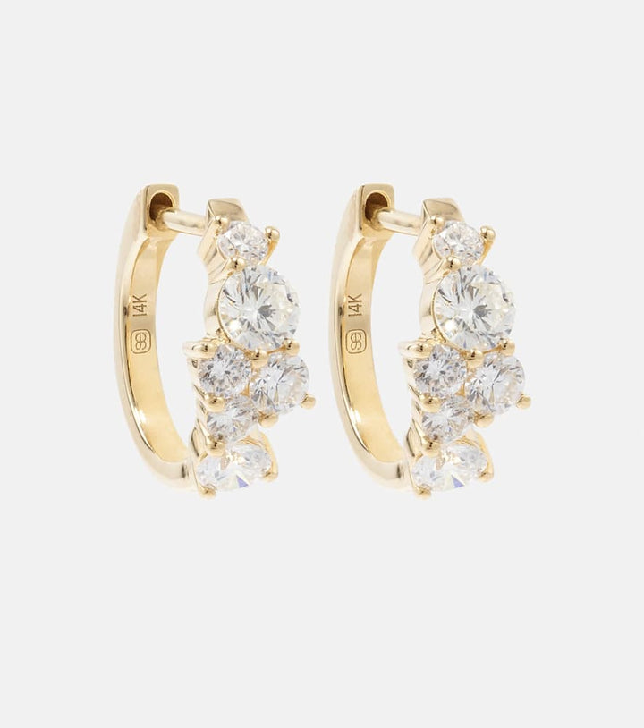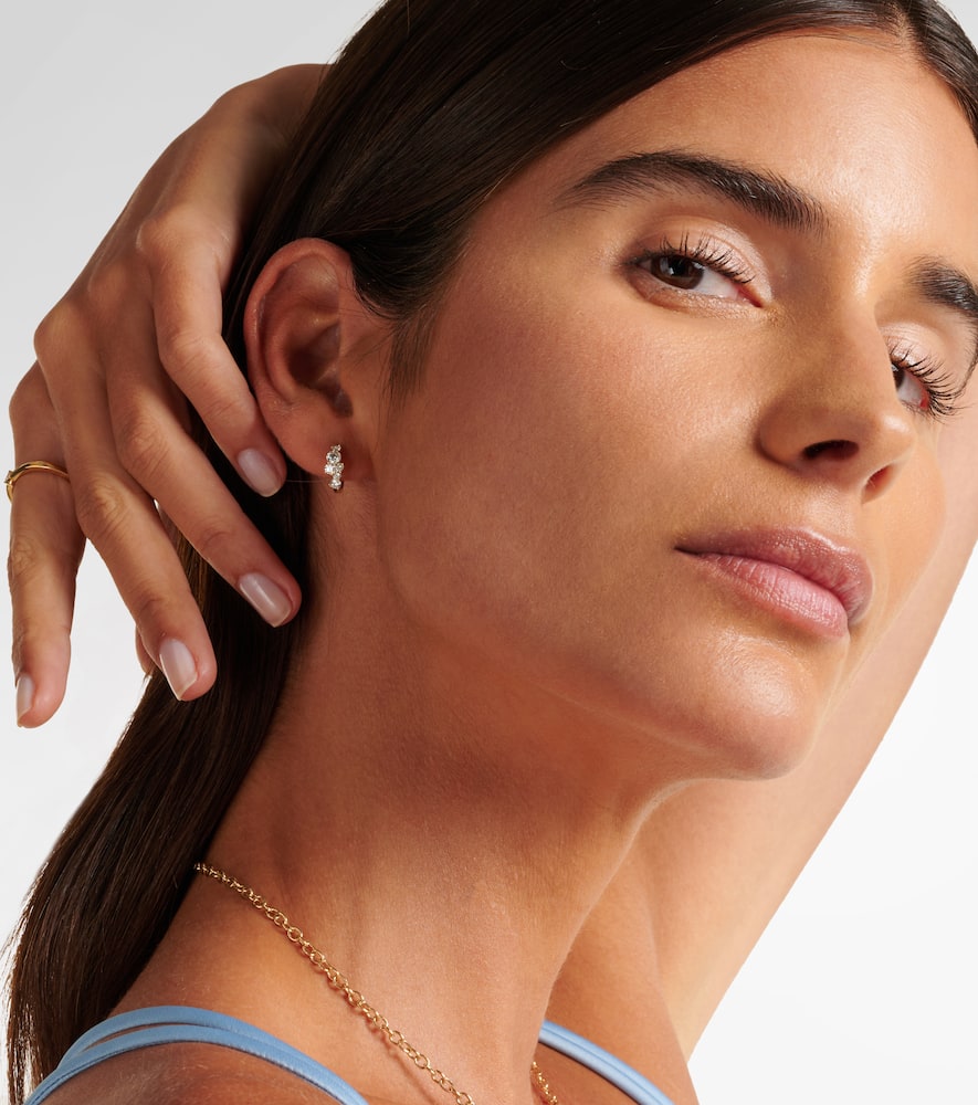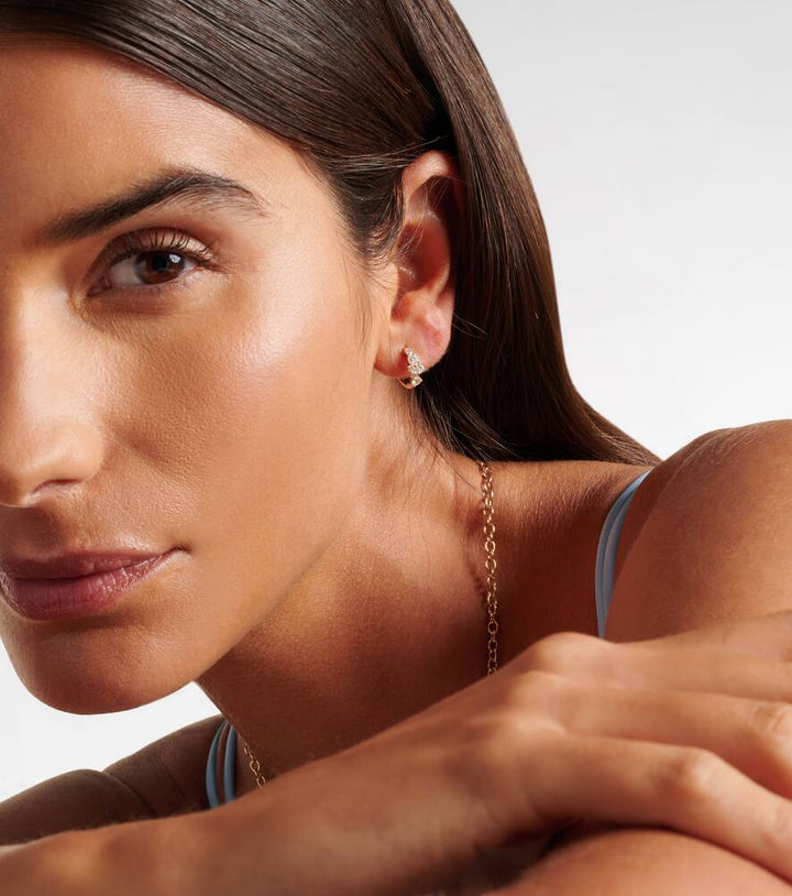 These Huggie 14kt gold earrings with diamonds by Sydney Evan are a modern and chic staple. The earrings feature a sleek, huggie-style hoop design in 14kt yellow gold, adorned with a continuous line of brilliant diamonds. This design creates a subtle yet captivating sparkle that is perfect for everyday wear. They are a versatile and timeless accessory that will seamlessly complement your personal style, whether worn alone or as part of a curated ear stack.