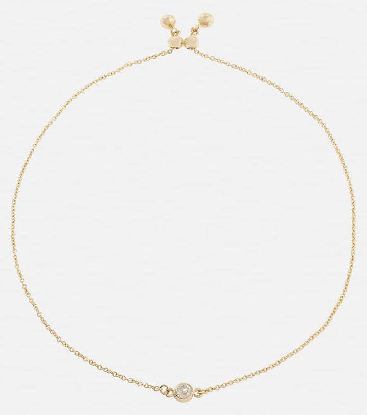 This 14kt gold bracelet with diamond by Stone and Strand is a delicate and beautifully minimalist piece. The bracelet features a fine 14kt yellow gold chain from which a single, brilliant white diamond is suspended. The design emphasizes the quiet elegance and pure brilliance of the diamond, making it a perfect piece for everyday wear. It is a timeless accessory that embodies a sense of personal strength and refined simplicity.