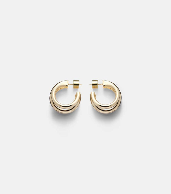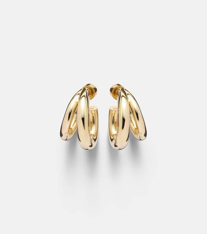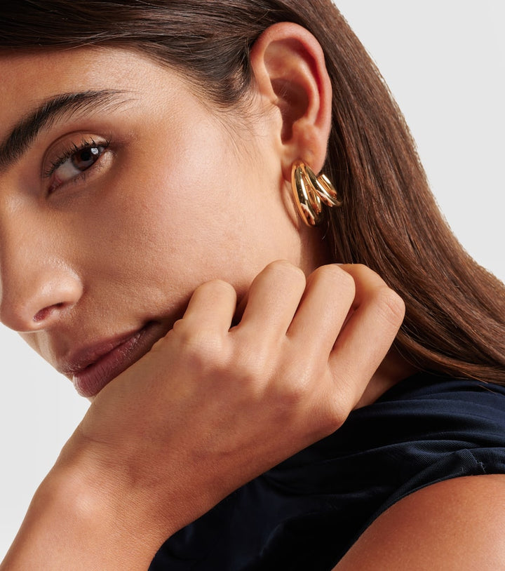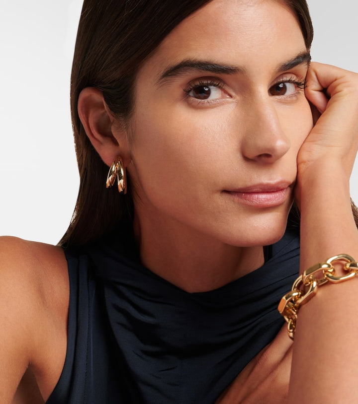 These 10kt gold-plated hoop earrings by Jennifer Fisher are a bold yet classic piece that captures a luxurious, modern aesthetic. The sculpted, chunky silhouette offers a contemporary and confident look, perfect for adding a statement touch to any ensemble. The warm gold plating provides a radiant glow, making them a versatile accessory for both day and night. These earrings symbolize a timeless, chic aesthetic and a love for elevated everyday staples.