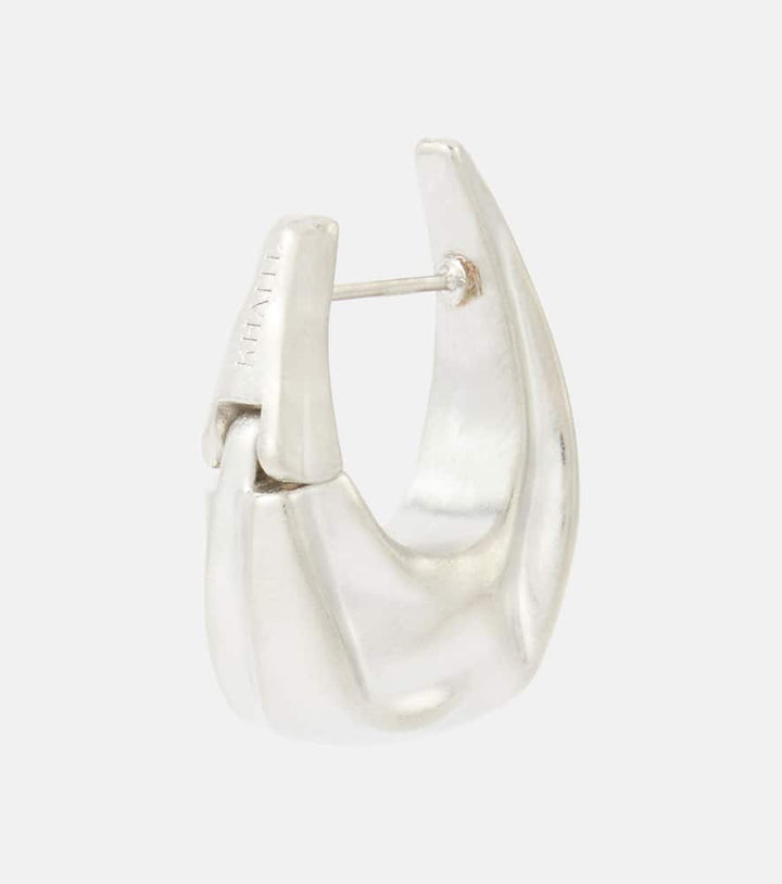 These Olivia hoop earrings by Khaite are a masterfully minimalist and sculptural piece that embodies a sense of quiet luxury. The bold, fluid silhouette, crafted from polished, palladium-coated brass, offers a clean and contemporary look. The earrings are designed for the woman who values an understated yet powerful aesthetic. They symbolize a refined sense of style and a confident approach to dressing, perfect for elevating any everyday look.