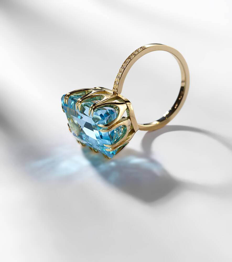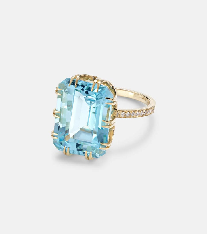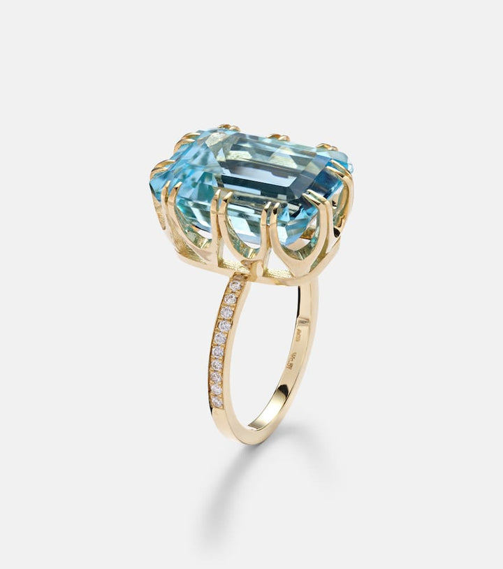 This 18kt gold ring with topaz and diamonds by Ileana Makri is a breathtaking and luxurious piece that captures the essence of classic elegance. The stunning emerald-cut blue topaz, a magnificent centerpiece, is beautifully complemented by a delicate scattering of brilliant diamonds. The warm yellow gold setting provides a perfect contrast, highlighting the gemstone's vibrant hue. This ring symbolizes a confident and sophisticated sense of style, a true heirloom piece.