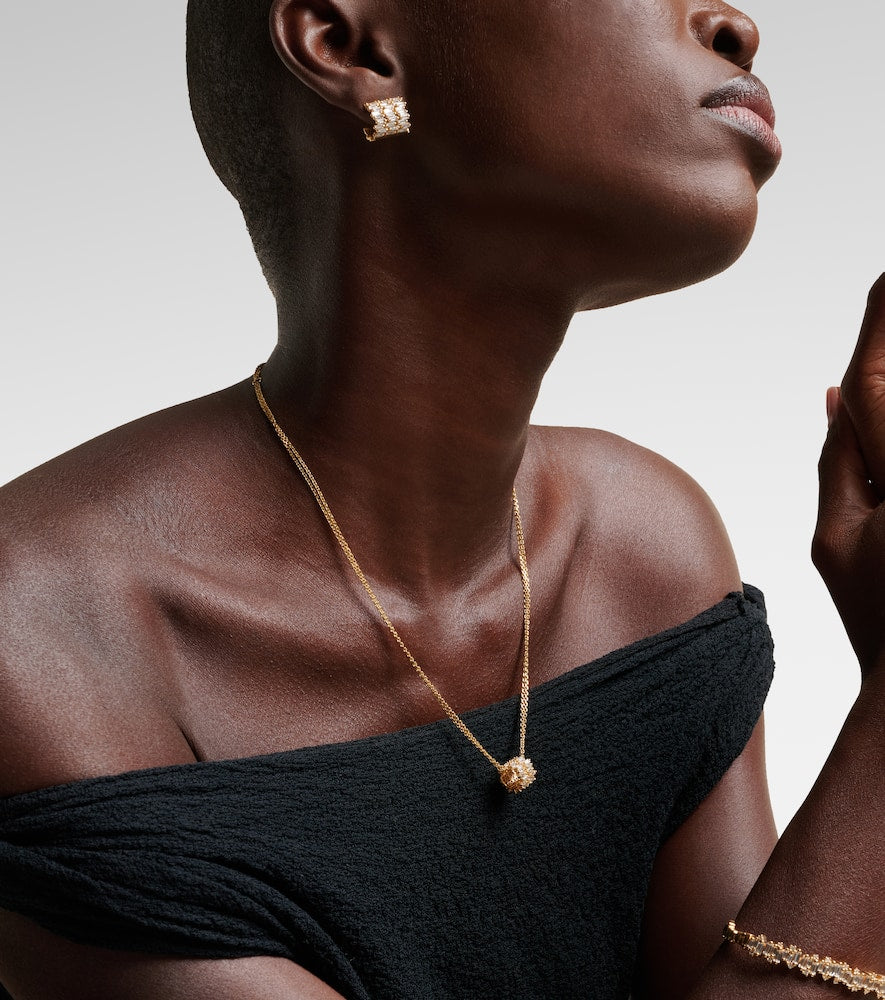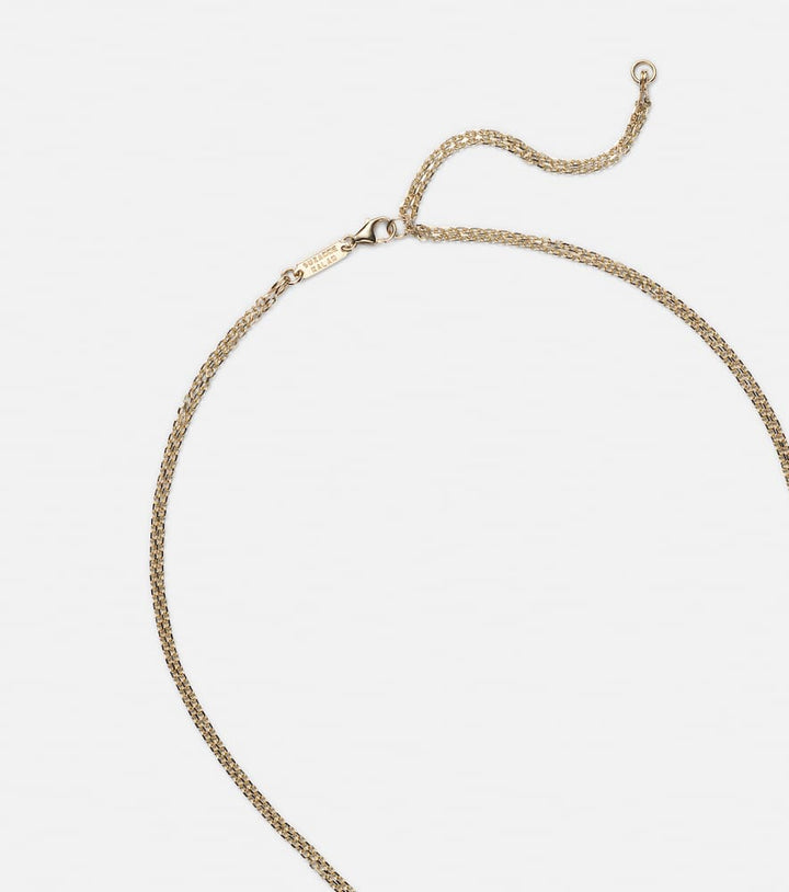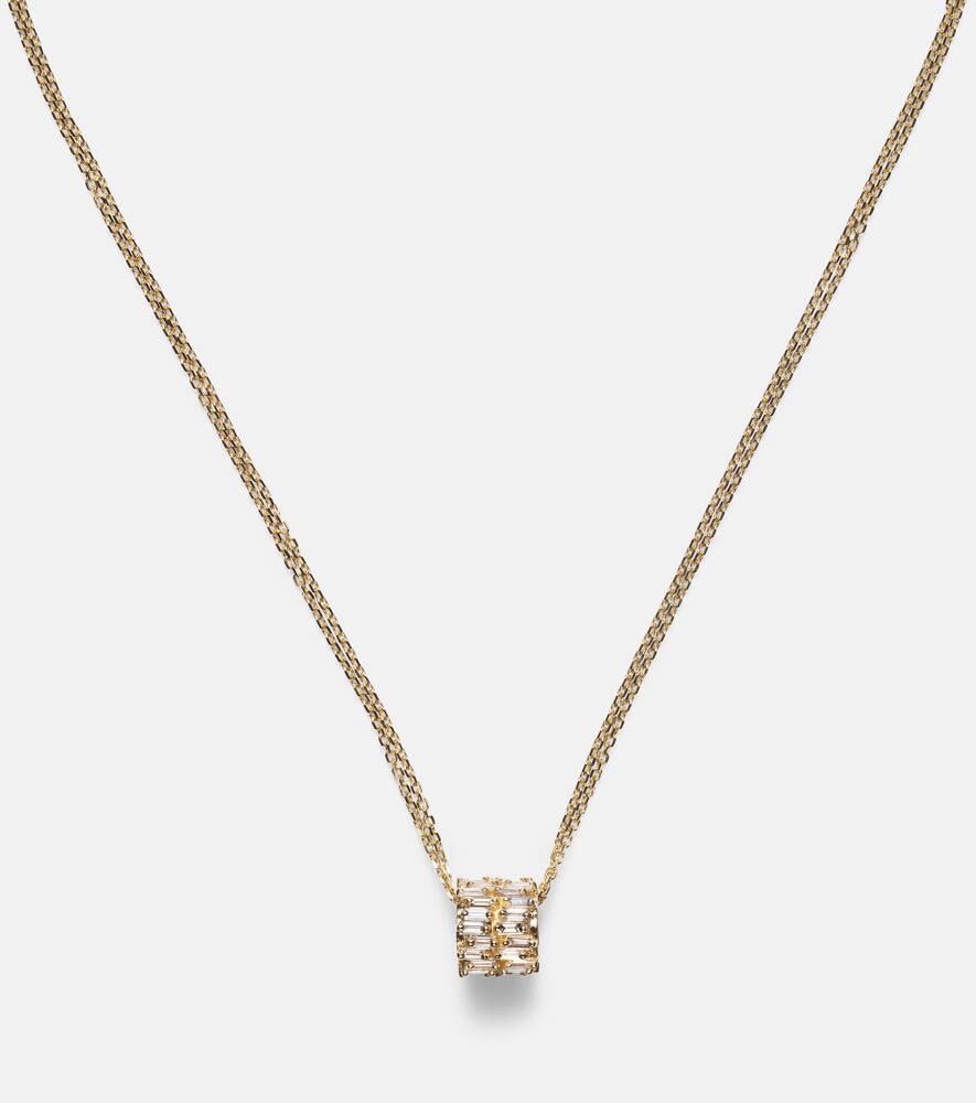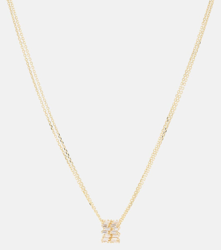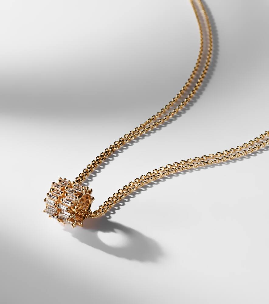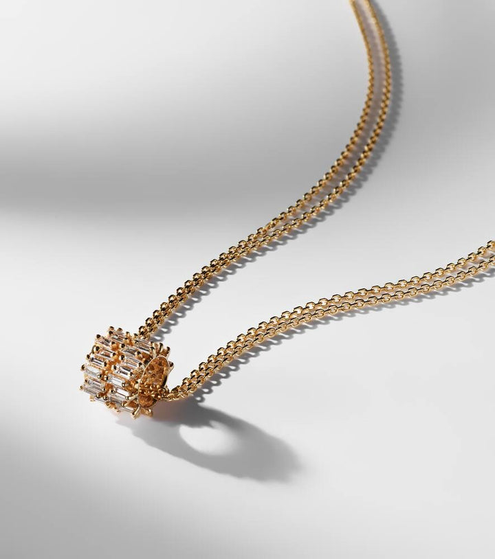 This 18kt gold pendant necklace with diamonds by Suzanne Kalan is a truly captivating piece that beautifully blends minimalist elegance with a touch of brilliant luxury. The delicate gold chain holds a simple yet striking pendant, exquisitely detailed with a brilliant diamond. This necklace is a versatile staple, perfect for adding a touch of sophisticated sparkle to any look. It symbolizes a love for timeless design and refined, personal adornment.