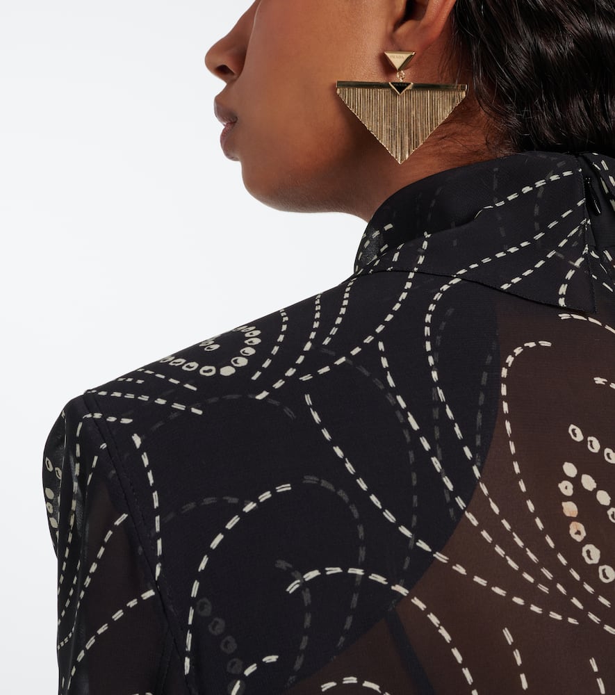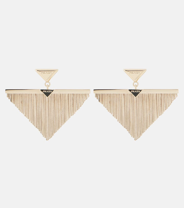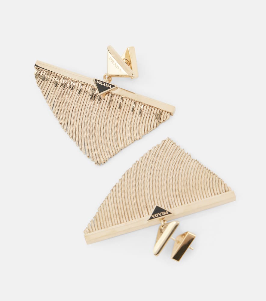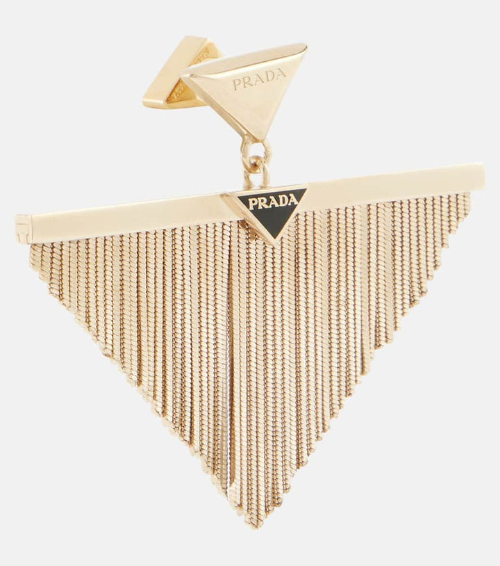 These Triangle embellished earrings by Prada are a bold and iconic statement piece that beautifully captures the brand’s modern, architectural aesthetic. The sculptural triangle silhouette, crafted from polished brass, is brilliantly adorned with sparkling glass crystals, creating a luxurious and eye-catching effect. These earrings are perfect for adding a touch of high-fashion glamour and confident flair to any look. They symbolize a powerful blend of heritage and contemporary style.