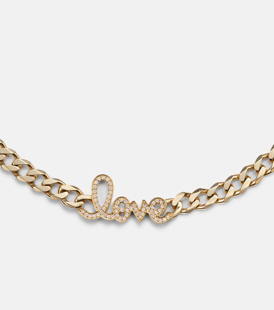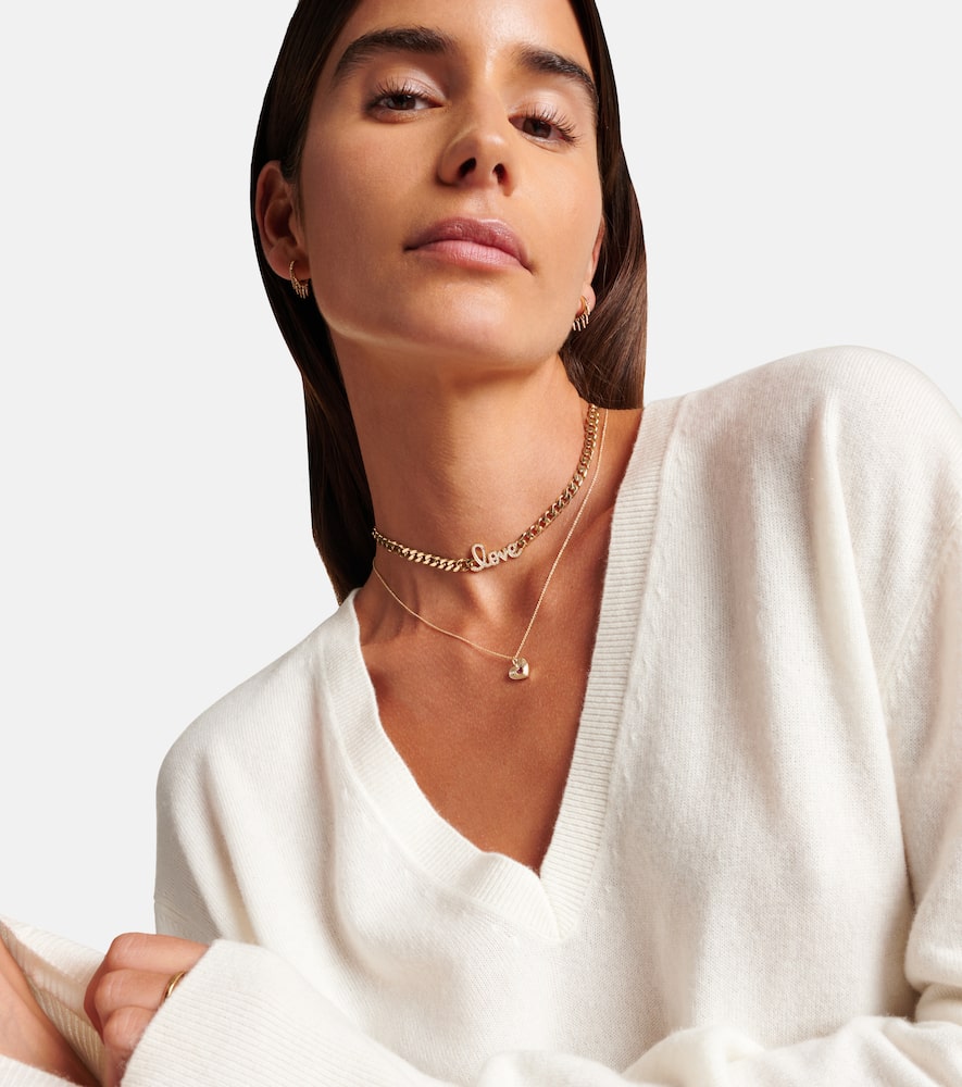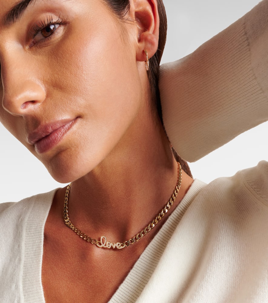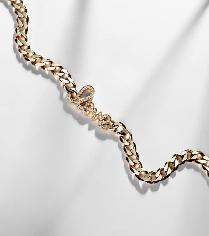 This Love Script 14kt gold necklace with diamonds by Sydney Evan is a delicate and meaningful piece that exudes a sense of modern romance. The elegant "Love" script, crafted from warm yellow gold, is beautifully adorned with brilliant diamonds, adding a touch of sparkle to this heartfelt message. This necklace is perfect for gifting to a loved one or wearing as a personal token of affection. It symbolizes a love for sentimental luxury and a refined, romantic aesthetic.