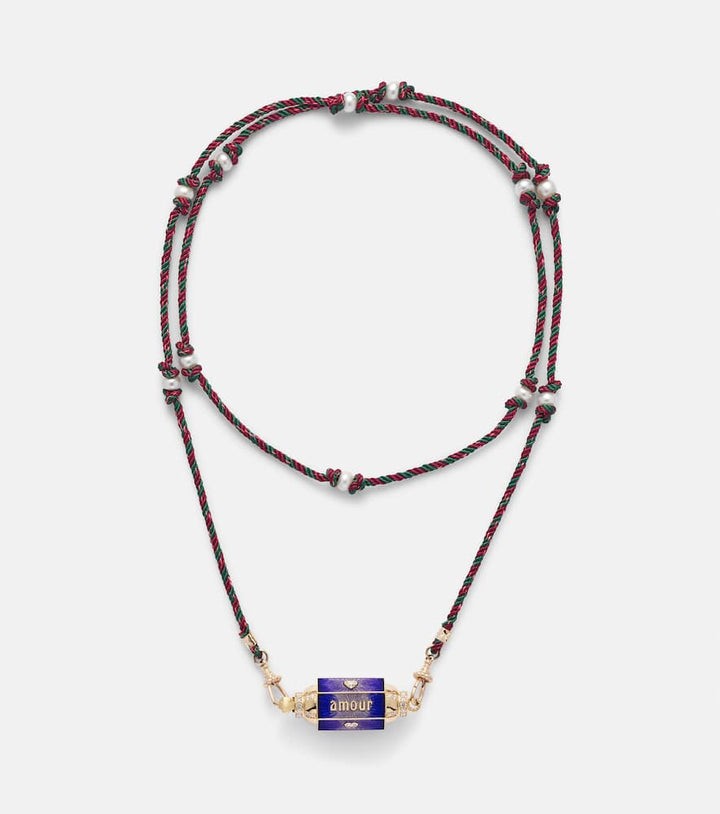 This necklace is handmade in Italy and features an 18k yellow gold locket with 1.02ctw of diamonds, along with a fabric cord and freshwater pearls. It measures 75cm (29.5 inches) when open with a minimum width of 2mm (0.1 inches) and a maximum width of 5mm (0.2 inches). The pendant is 15mm (0.6 inches) long and 44mm (1.75 inches) wide.
