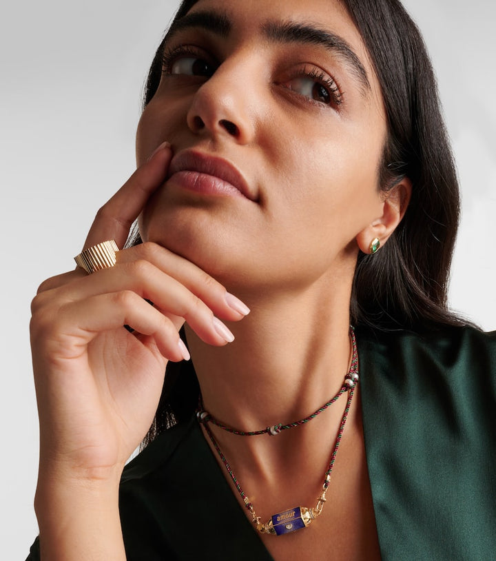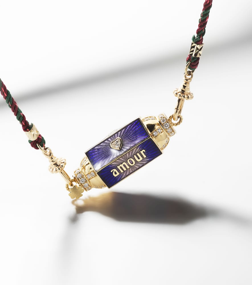 This Amour Toujours 18kt gold locket with diamonds by Marie Lichtenberg is a whimsical and luxurious piece that beautifully blends classic romance with a bohemian flair. The delicate gold locket, inscribed with "Amour Toujours" (Love Always), is adorned with brilliant diamonds and hangs from a unique fabric cord. This necklace is a personal and symbolic statement, perfect for holding a cherished memory close to your heart. It symbolizes a love for sentimental and artistic jewelry.