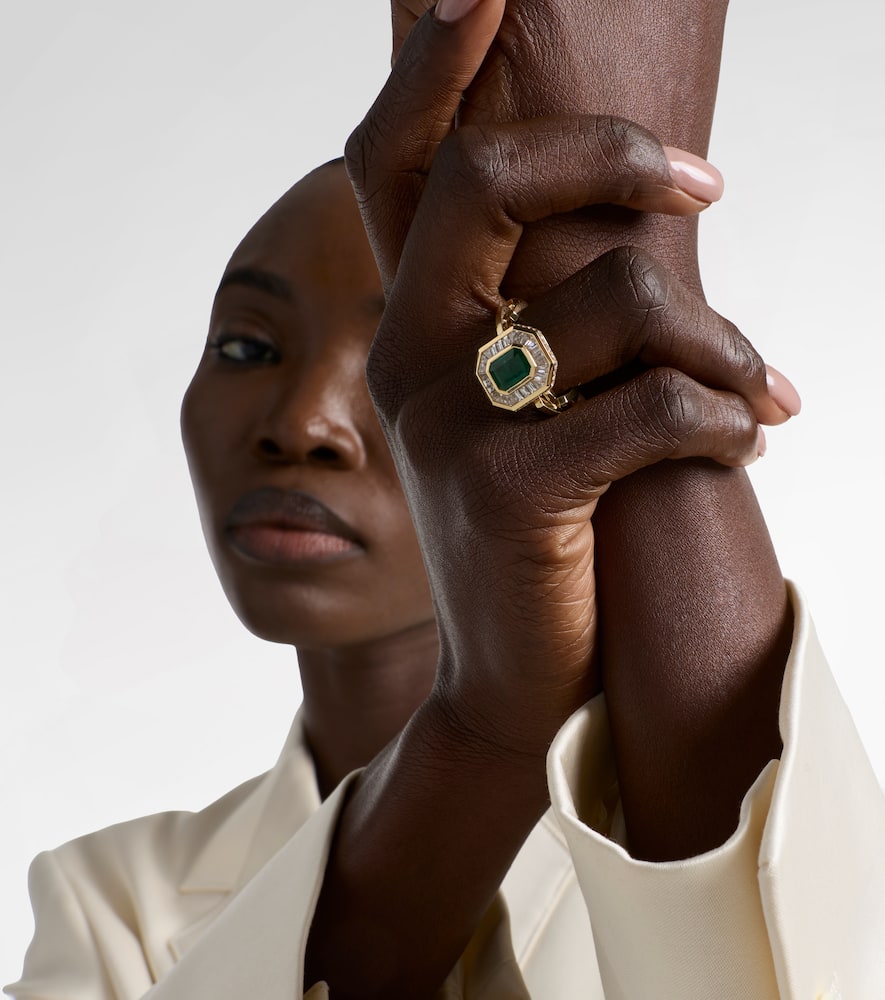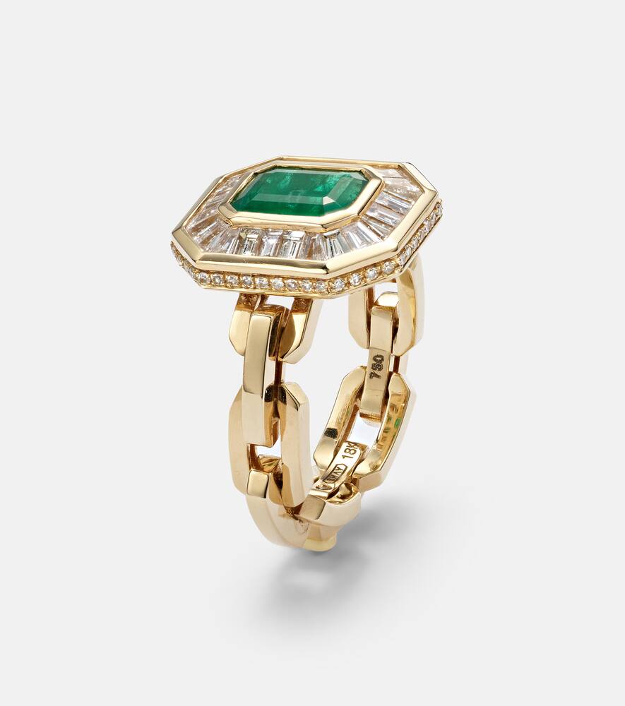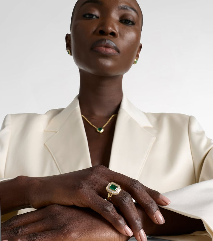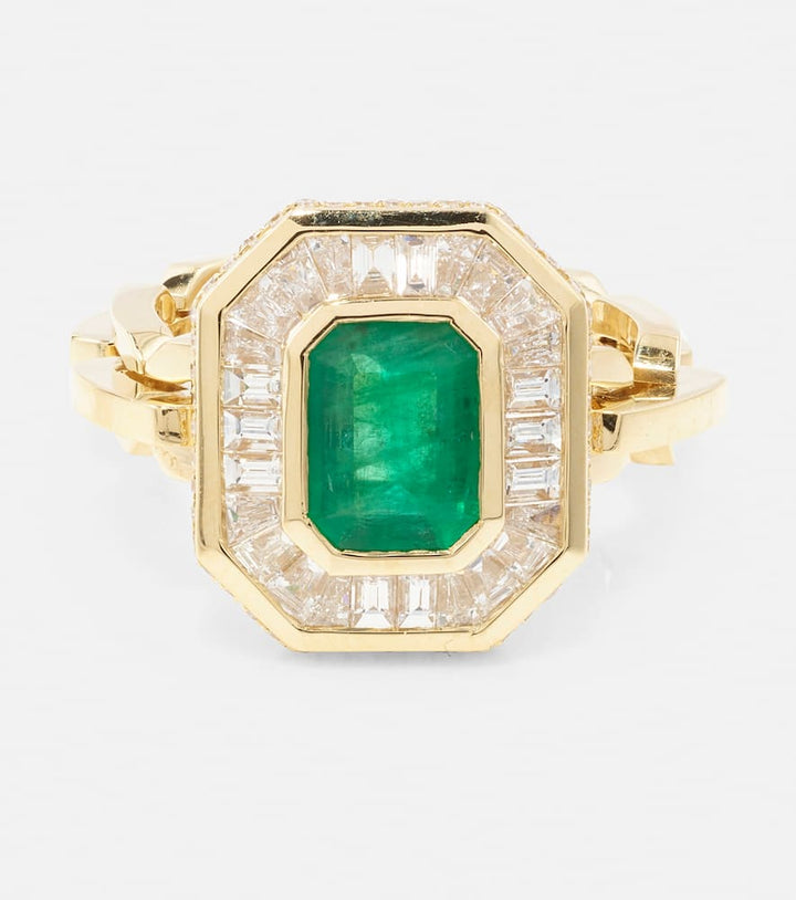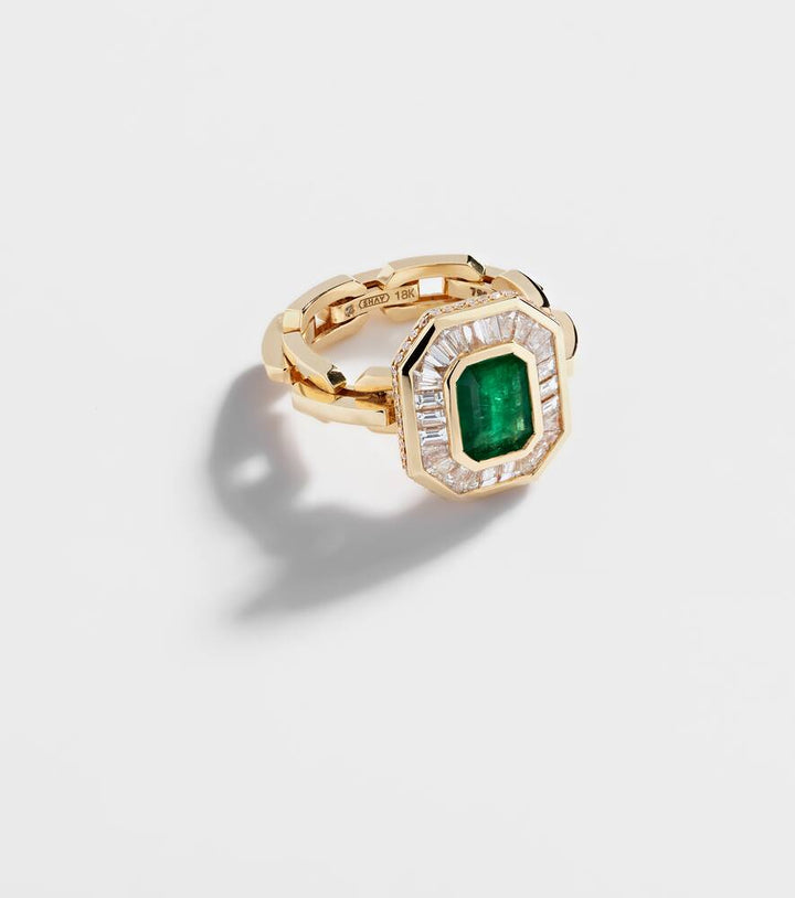 This Halo Mini 18kt gold ring with emerald and diamonds by Shay Jewelry is a breathtaking and luxurious piece that beautifully captures a sense of sophisticated glamour. The bold, sculptural design features a magnificent emerald-cut emerald, beautifully surrounded by a halo of brilliant baguette and round-cut diamonds. This ring is a confident statement of style, symbolizing a love for both natural beauty and a refined, artistic aesthetic.