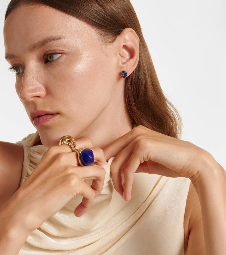 These 18kt rose gold earrings with blue sapphires by Shay Jewelry are a stunning and vibrant piece that captures a sense of modern elegance. The unique, sculptural design features a magnificent, oval-cut blue sapphire, its deep hue beautifully complemented by the warm rose gold setting. These earrings are a confident statement of style, symbolizing a love for both bold color and a refined, unconventional approach to fine jewelry.