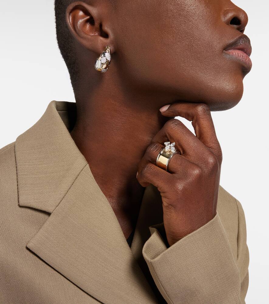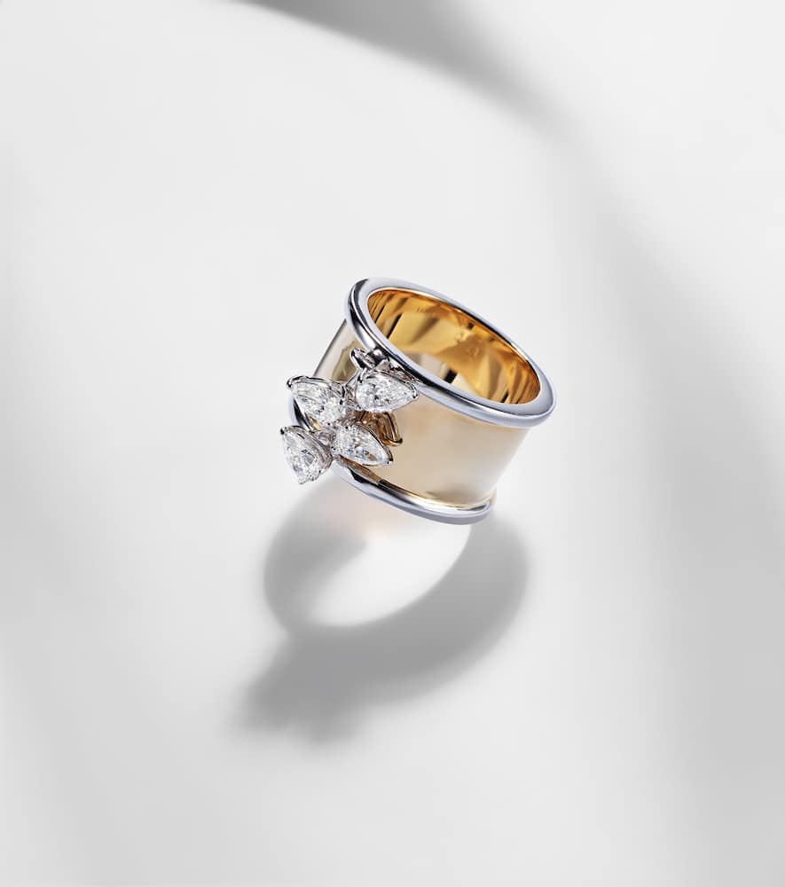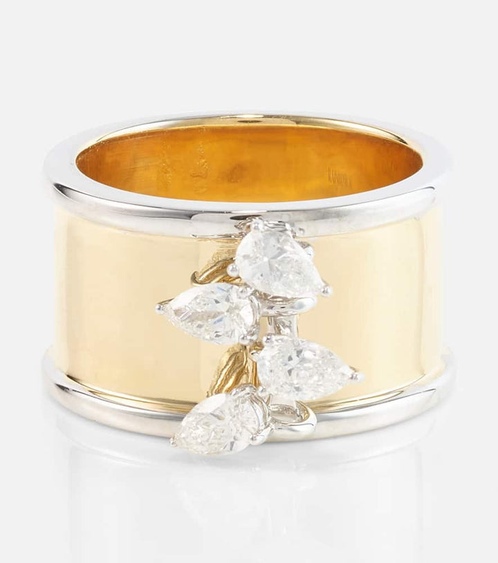 This Rainbow K Erin 18kt Gold and White Gold Ring with Diamonds by Rainbow K harmoniously blends yellow and white gold with pear-shaped diamonds, symbolizing sophistication and elegance. Its striking dual-tone design makes it a versatile statement piece for both formal and everyday wear.