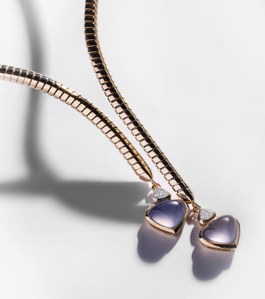 This Marina B Trisolina 18kt Gold Necklace with Blue Chalcedony and Diamonds by Marina B combines luminous chalcedony cabochons with delicate pavé diamonds, creating a harmonious and refined aesthetic. The piece evokes serenity and sophistication, ideal for elevated occasions.