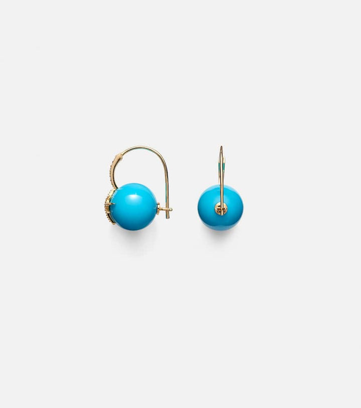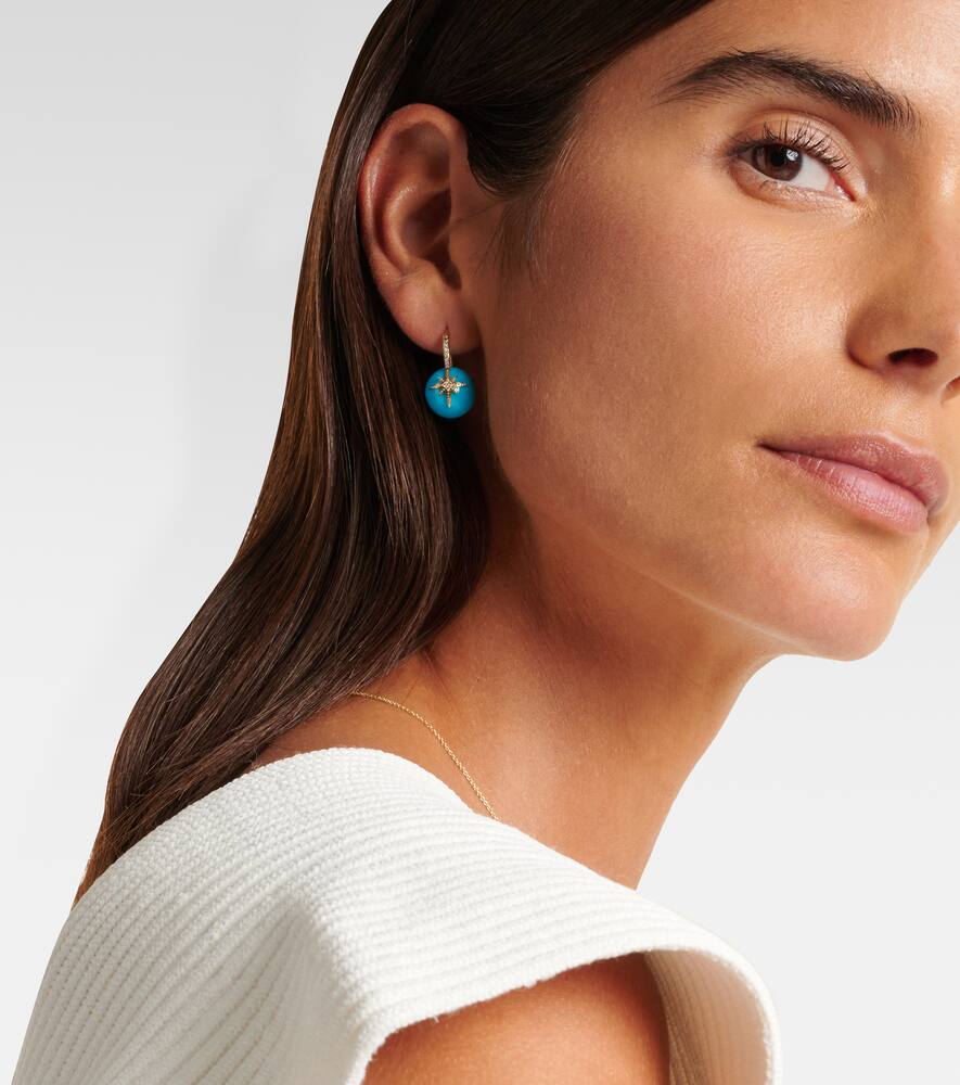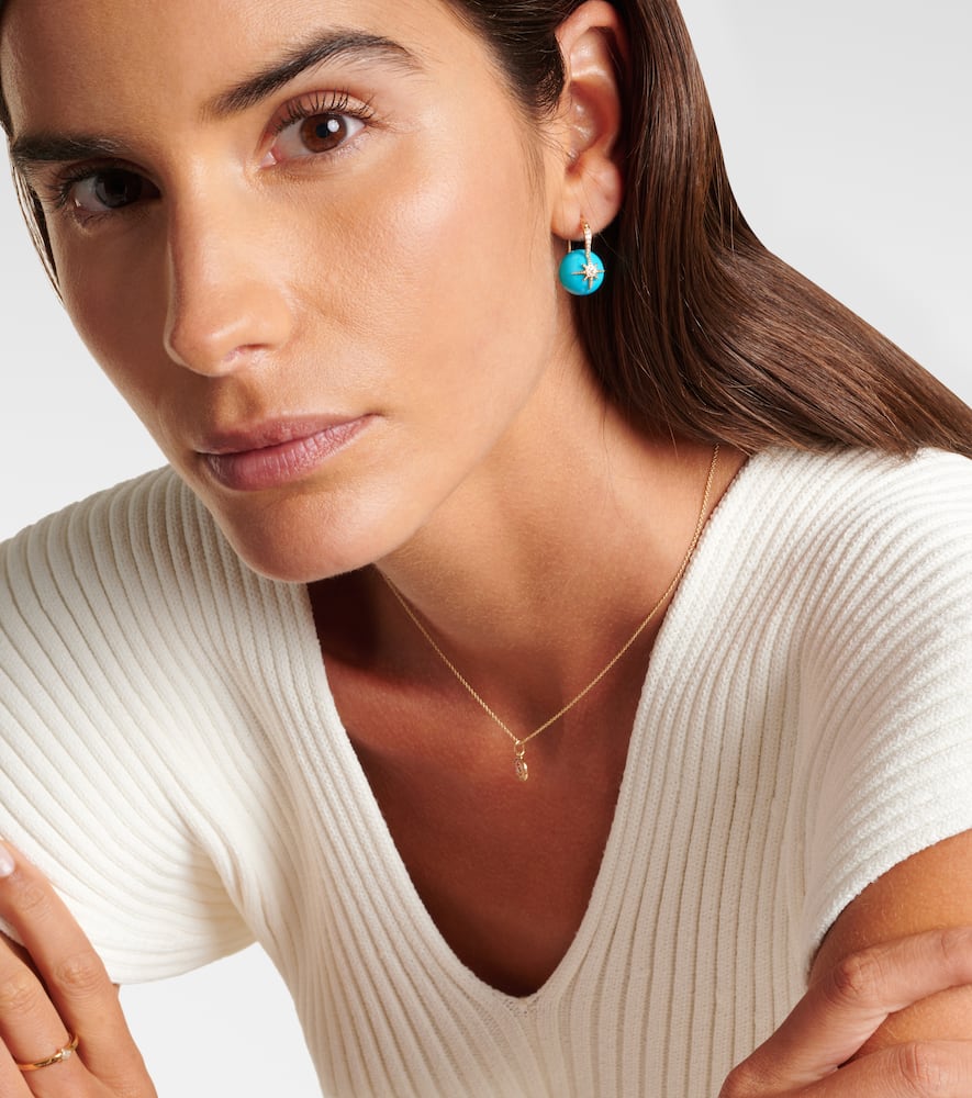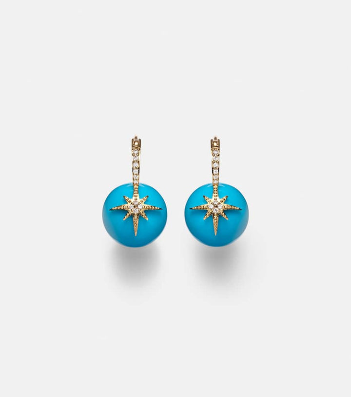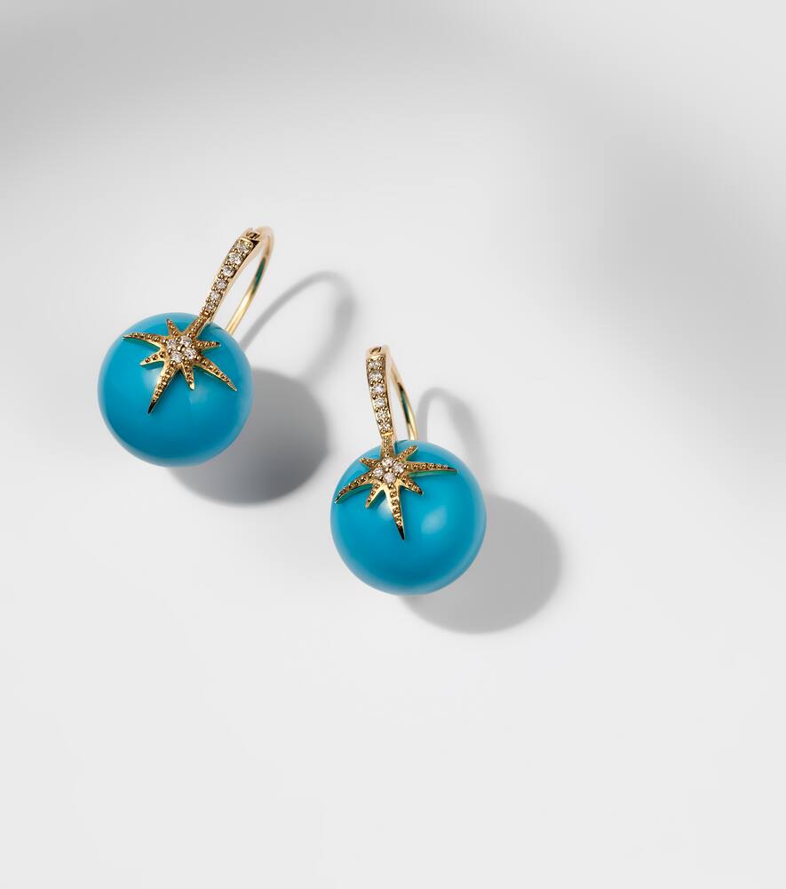 These Sydney Evan Starburst 14kt Gold Earrings with Turquoise and Diamonds by Sydney Evan capture celestial elegance, featuring pavé diamonds radiating around turquoise beads. The design conveys refined sophistication and playful charm.