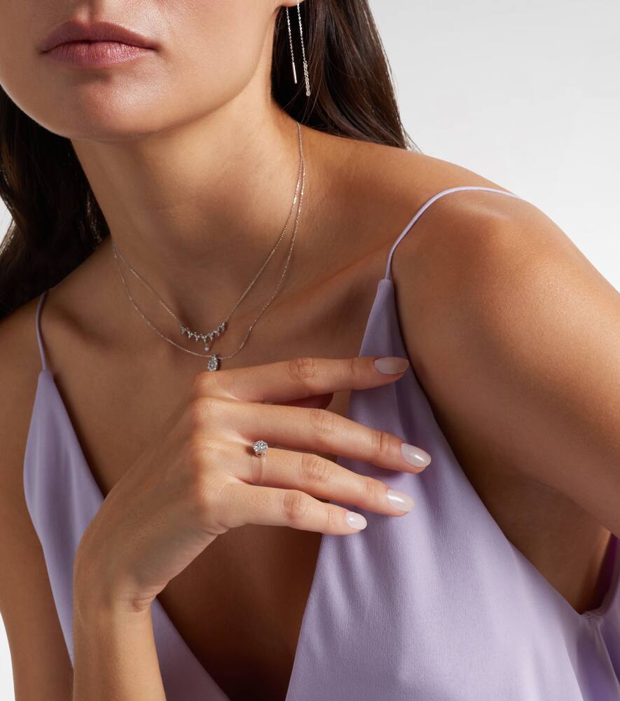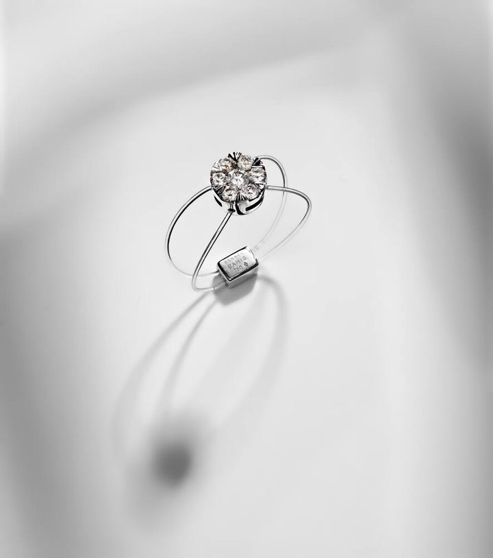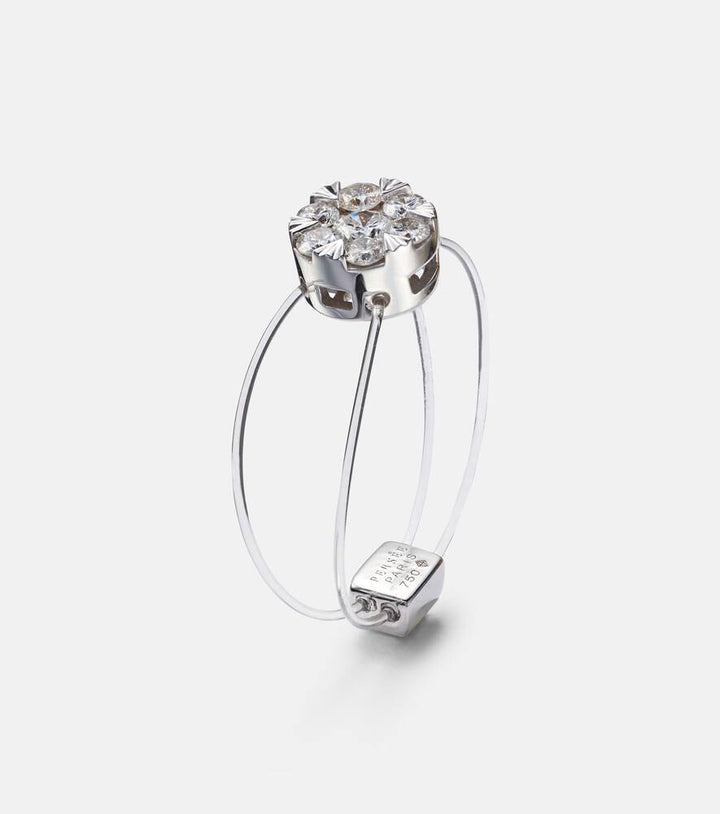 This Persée Floating 18kt White Gold Ring with Diamond by Persée combines modern minimalism with sparkling elegance, featuring diamonds seemingly suspended along the sleek band. Ideal for stacking or wearing alone.